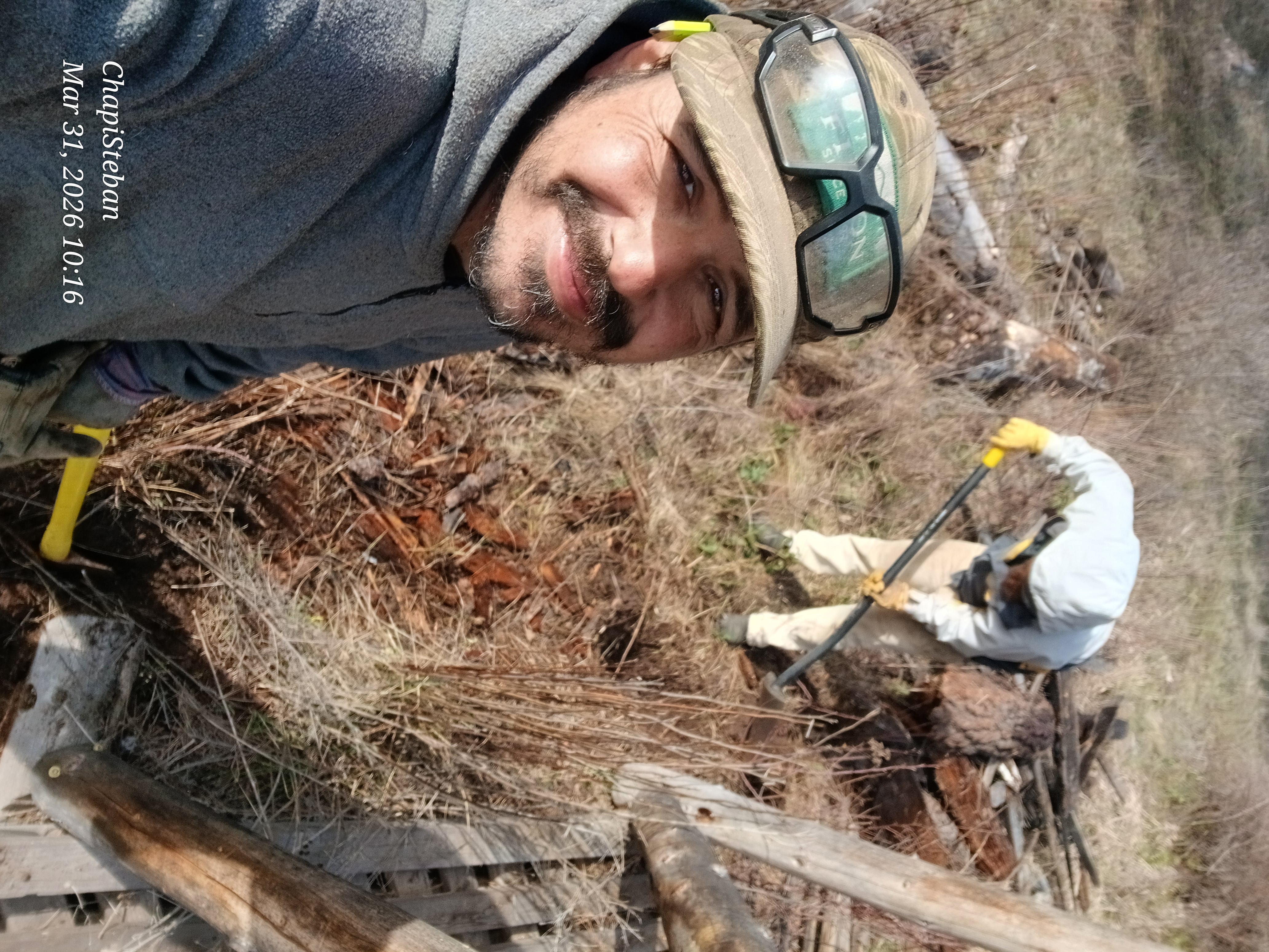 After wrapping things up there, we headed back to basecamp. While Stephen was in a meeting with Paul, the three of us—Seth, Melissa, and I—kept the momentum going by processing the woody bits we had hauled back from the Cooper Cabin woodshed. It felt good turning a messy pile into something more useful and orderly.