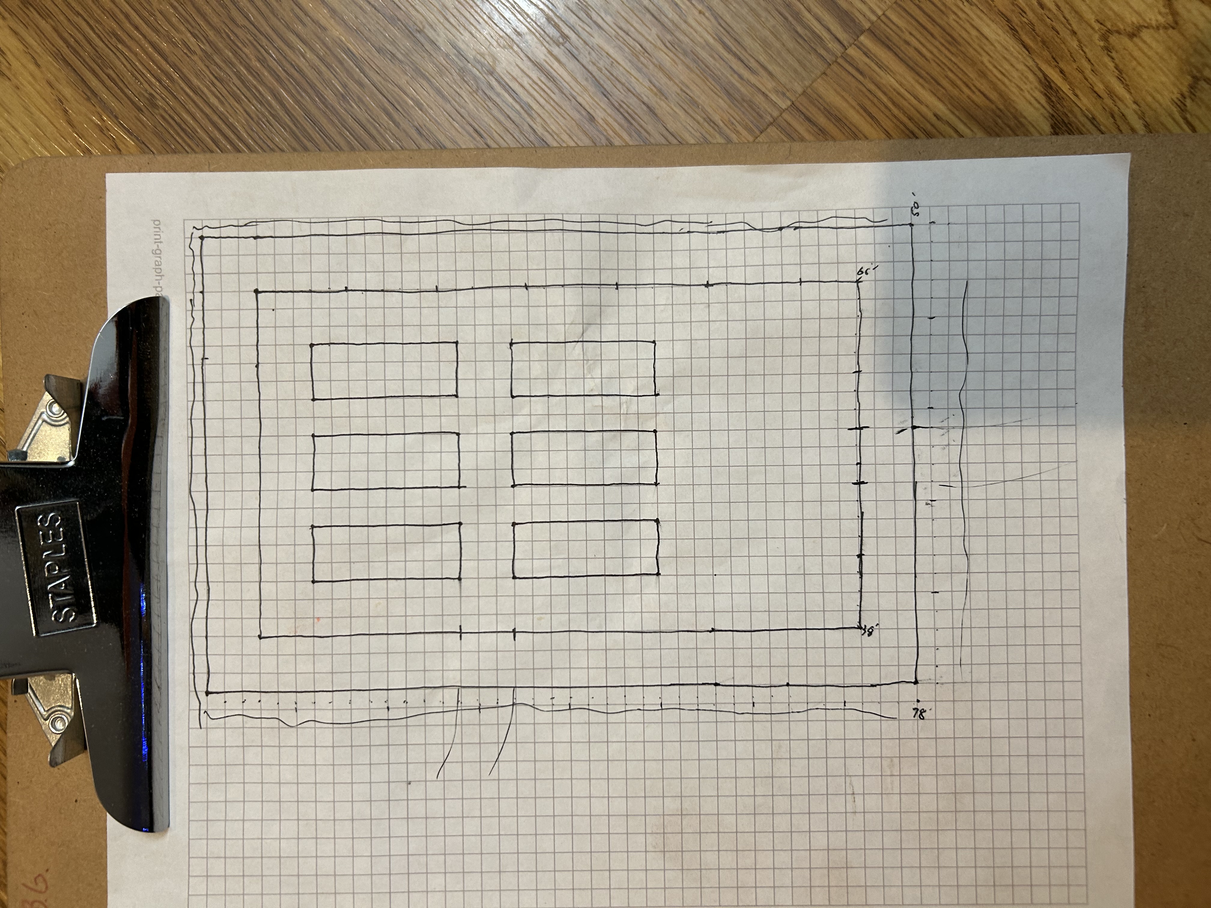 In my sketch, there are two rectangular lines that are notable. The first, inner one that encompasses the six beds is the fence. Outside of that is another line. That line is a bit more imaginary. I plan on having at least a 6' pathway that wraps around the fence, so that line is just the edge of the path. I guess you could call it the beginning of the tall field grass again.