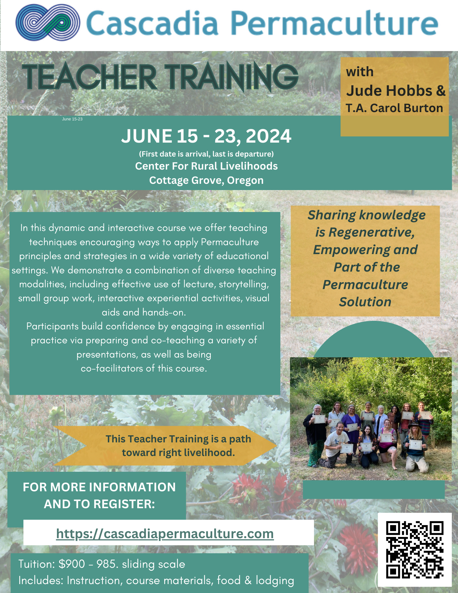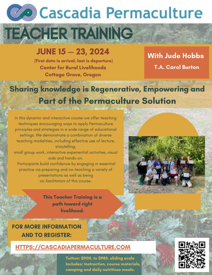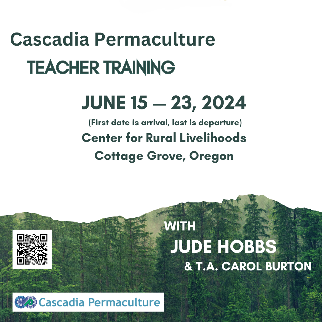 The next Cascadia Permaculture Teacher Training facilitated by Jude Hobbs will be happening June 15th to the 23rd, 2024.