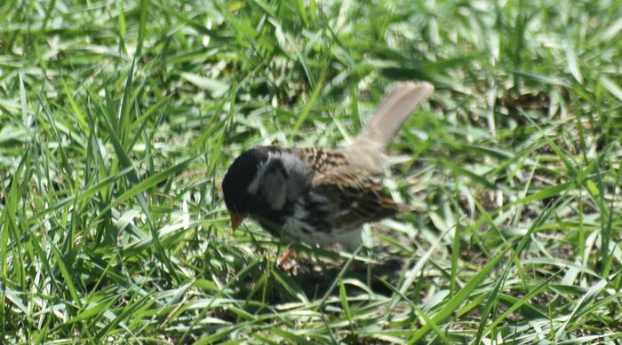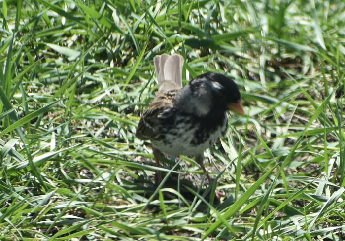 Harris' sparrow - shot through a window from inside the house, below the feeder