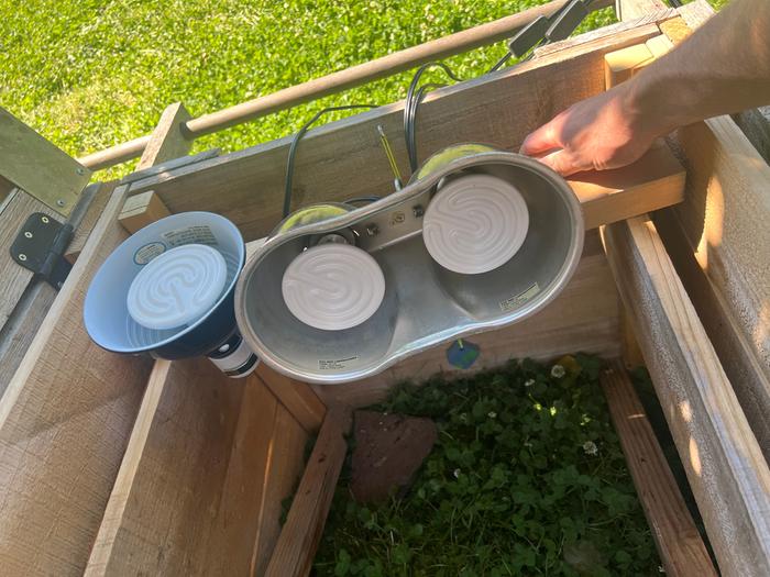 This is going to be moved in my mowable meadow, which has replaced my former lawn. Given its proximity to the house, I took the easy way and added heat lamps. I both had them and felt reassured using them. But not so reassured as to get complacent, I added a Bluetooth thermometer just in case.