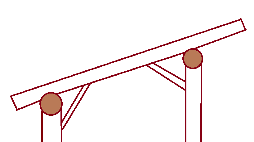 My current thinking is to add two beams to the crude drawings in the first post. So each cant (two posts, the beam and two angle braces) will stand up and then a pair of horizontal beams will connect them with tenons. This seems to be how timber frame buildings are designed. Then the rafters can just sit on the assembly and they're no longer holding the structure together.