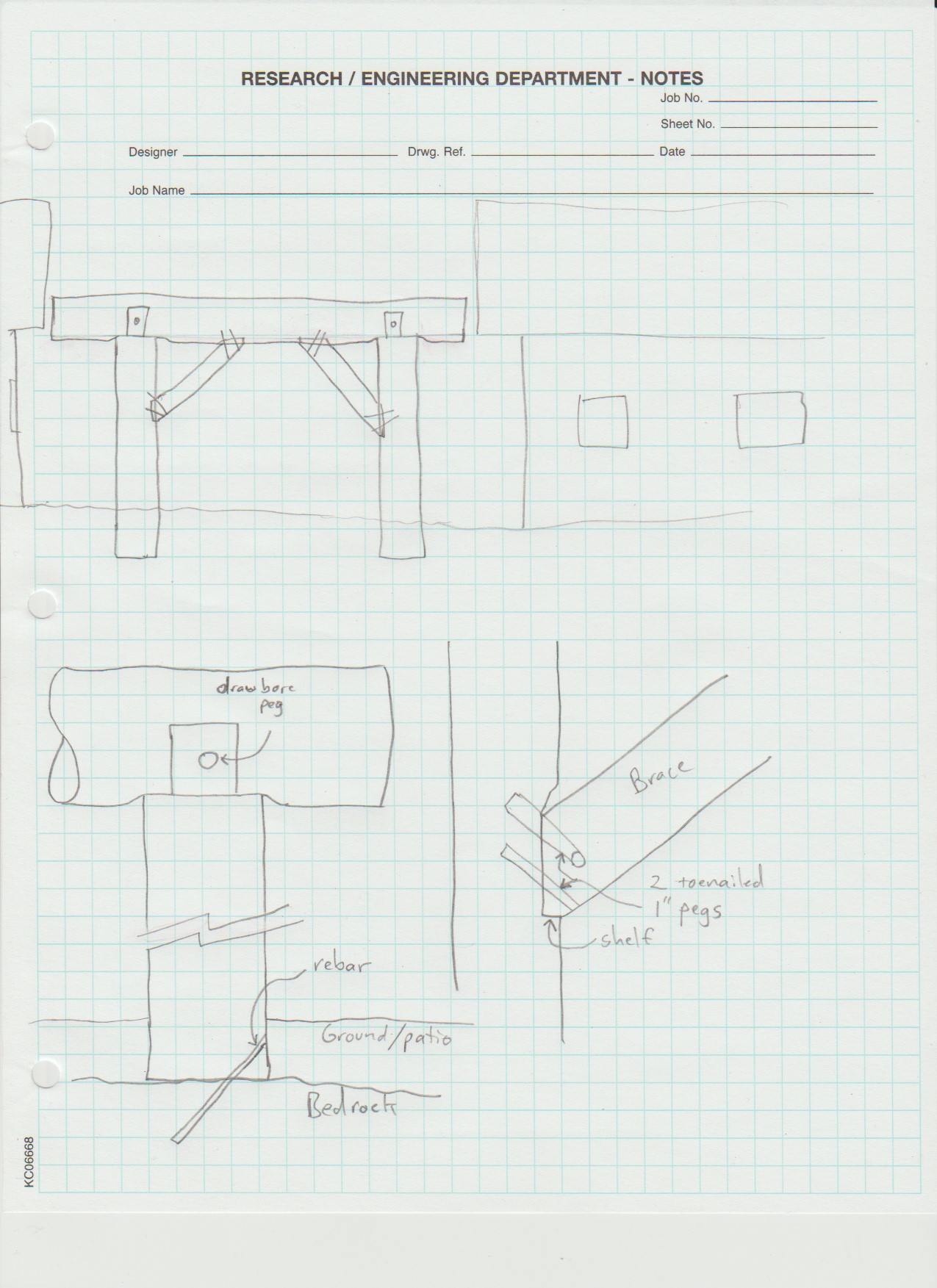 The first drawing shows the cant details. The posts would have a square end with a tenon sticking up from them. The beam would have some shallow flat spots carved in them to rest on the posts. I've read that getting the heartwood of the beam sitting on the posts is a good idea. Offset peg holes would be drilled through the beams and tenons so when a peg is driven in, it would suck the tenon into the mortise a smidge. Kris aims for 4mm of offset. I'm thinking these pegs should be 1.5" diameter?