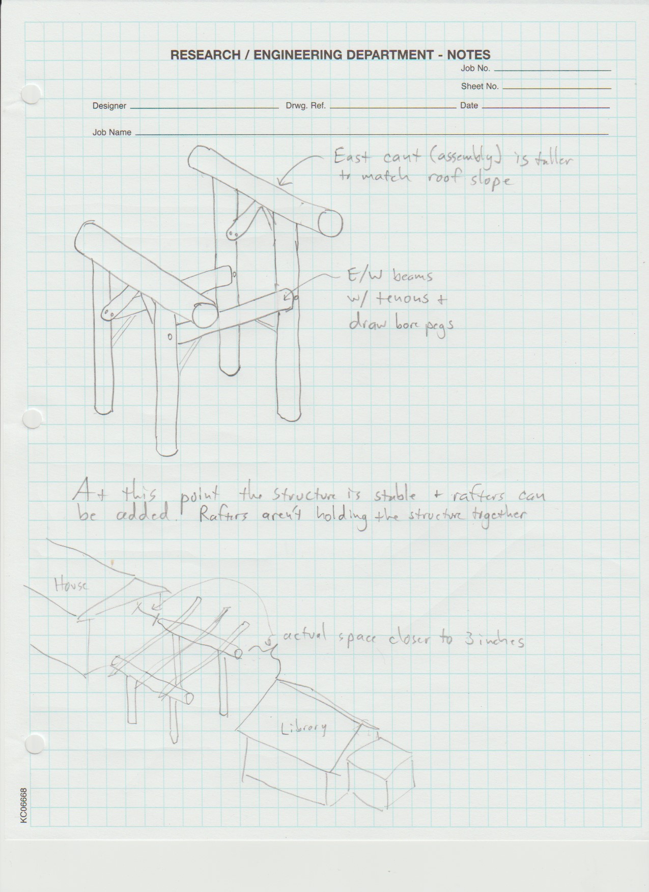 The second drawing shows the new beams that tie the two cants together. I think drawbore tenons would be a good way to pull the structure together. One issue is that one of the cants would have to move towards the other to seat the tenons in the mortises. Not impossible... These beams would be pretty high, likely above the person door into the library.
