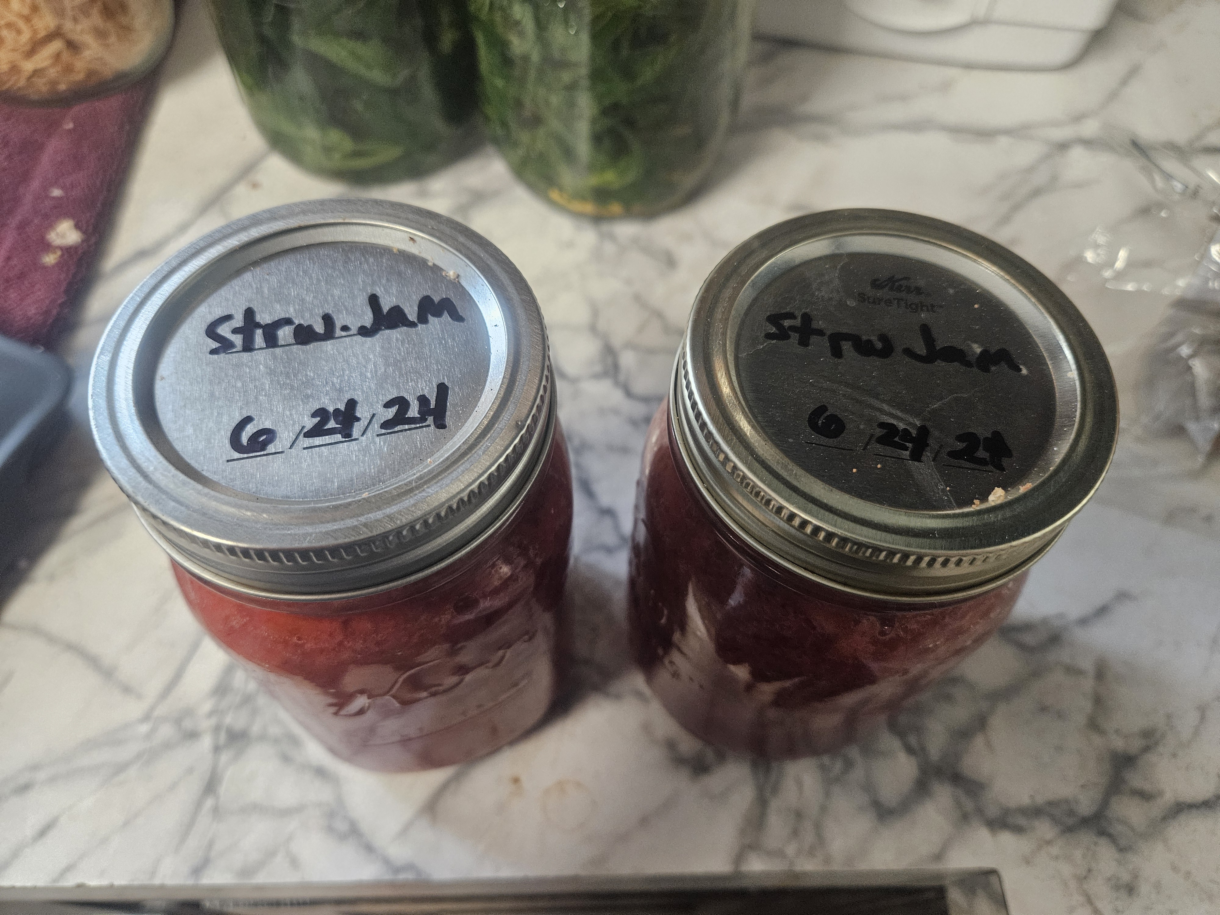 Hey Yall! I estimate I preserve/store half a million calories a year. Welp. There's a bb for that. So it's time to put money where my mouth is and see exactly how much I do preserve. Here's the very first thing I am storing for 2024: strawberry jam. There's about 1800 calories in a pint of strawberry jam. So the first post includes 3600 calories.