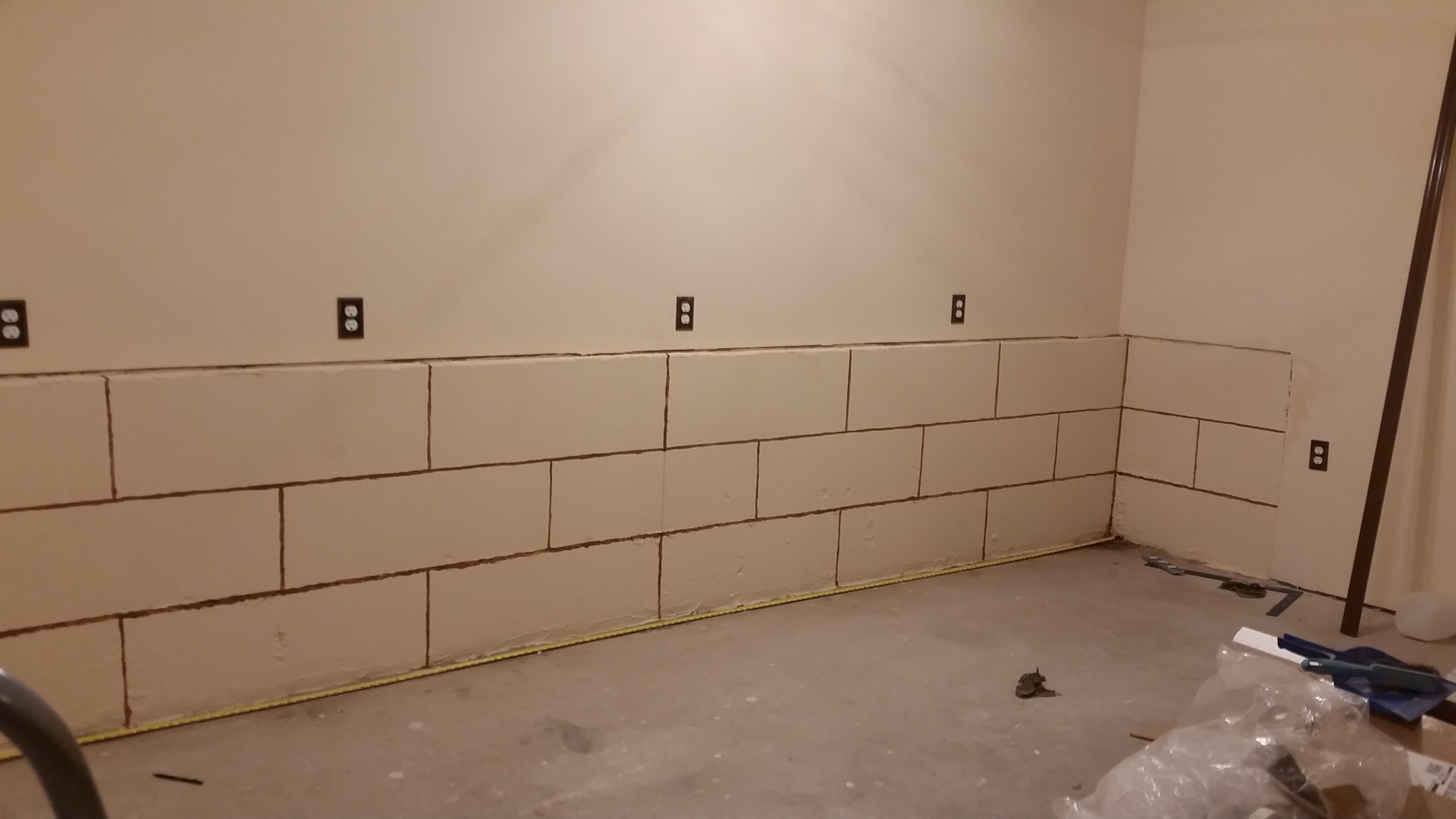 Because our first batch was not mixed well enough, it was quite a few shades darker than the next batches! You can see it here on this partially painted wall