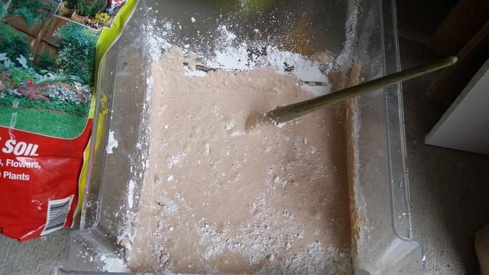 We also found it helped to mix in a 5 gallon bucket. This reduced splashing and made it easier to add the dry ingredients bit by bit. It was surprising the amount of dry ingredients we added to the milk curds. Here's the recipe we used for our creamy off-white color: