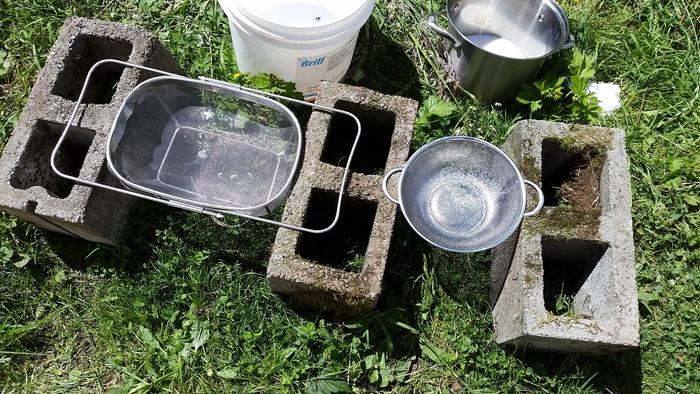 Our two stainers, propped up by bricks. Behind is the buckets we had the skim milk in before we poured it off