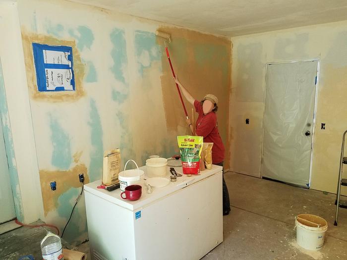 I thought I would try painting directly onto the latex paint. First, I washed the wall, and then we mudded parts of it, and then I painted. The paint stuck just fine!
