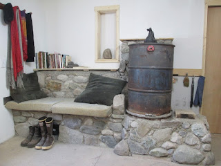 Thanks for bringing up the idea of wood benches. Yes, you can use a wooden box to surround and control the masonry thermal mass 'infill', as long as you use good clearances to the hotter parts of the system (the firebox, upper barrel, and first few feet of exhaust). Our bench at home has wood trim on the bench and bench top, and you can see we are very comfortable with cushions and even books right in contact with the bench mass. But I chickened out and used a similar-colored Saltillo tile for the mantle behind the barrel.