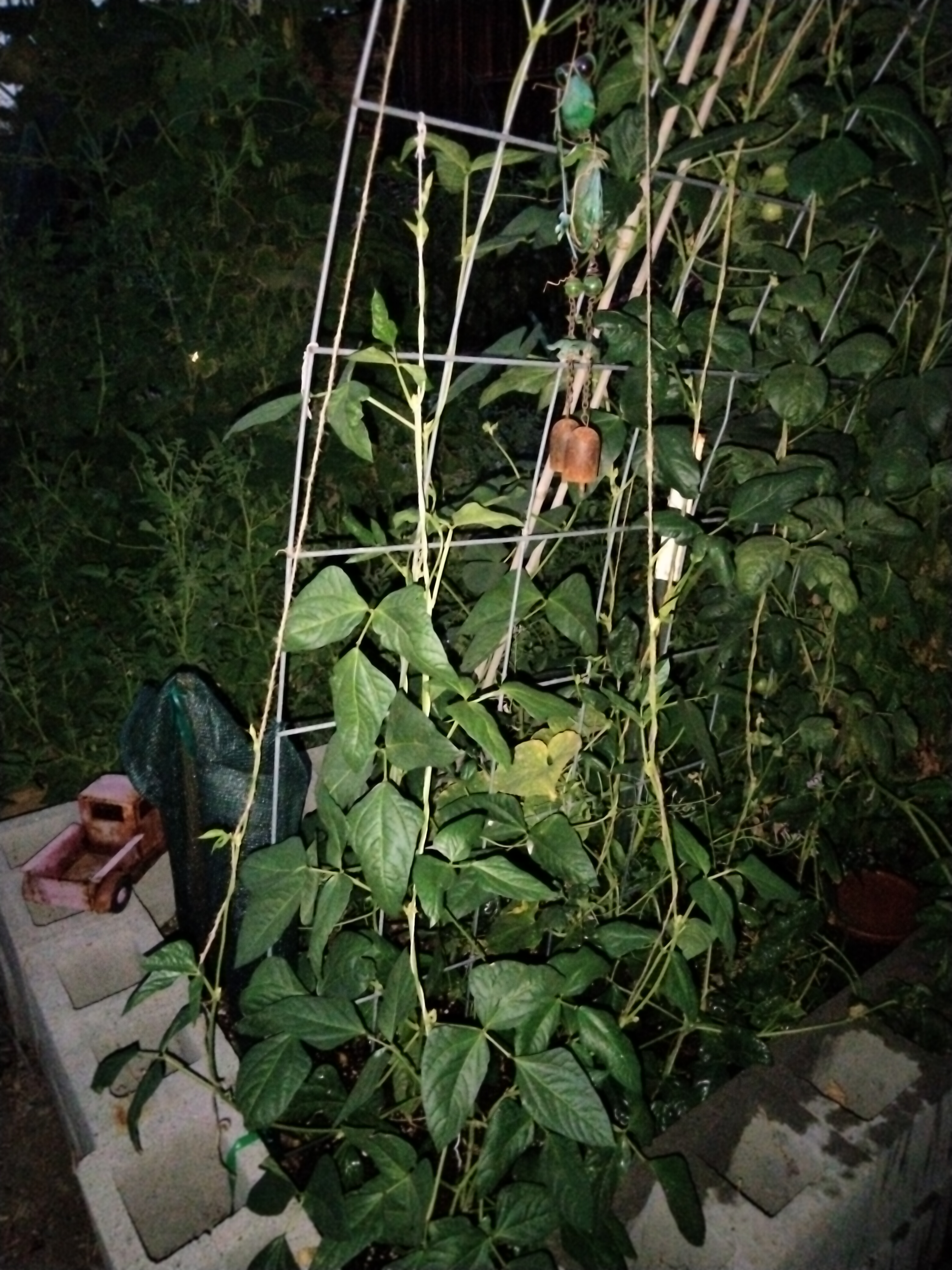 I'm finding using string/twine is a game changer for growing beans. I know that's not why they used to be called string beans, but it fits anyway. I learned this year that beans are a bine, rather than a Vine. A vine has those little curly things that grab onto what it's going to climb, and a bine wraps itself around and around what it's going to climb. I kind of knew this, but didn't really think about it. I watched video that talked about it. Said you should plant the bean next to what it's going to climb to make it easier. I did this, but I think I planted to late, maybe they didn't get enough sun because they grew about a foot and stopped. But I had a bunch of volunteers grow well. The problem was they were not close to the trellis. I tied string to one of the high rungs, and cut it long enough to touch the soil. I held it taught, and wound the bean around the string. They continue to climb to the top of the trellis. It worked so much better than planting next to the trellis.