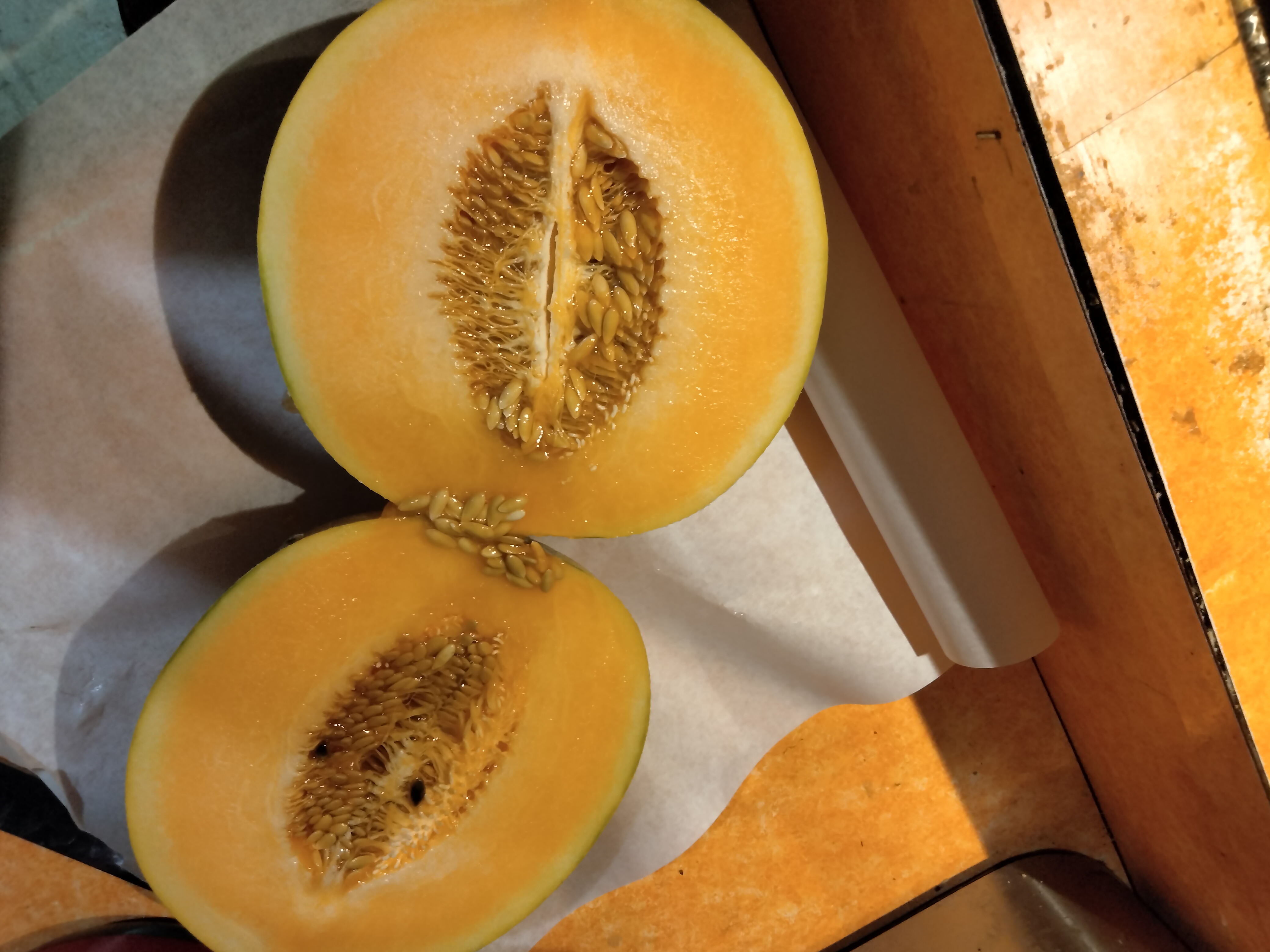 Today I picked the first ripe melon big for a cantaloupe, a little small for a Crenshaw. It has the color of Crenshaw, but a little netting like a cantaloupe. Most important is it tastes so good. Super juicy, and so sweet. It's funny not only did everyone love it, but they all said I should make sure to save the seeds.
