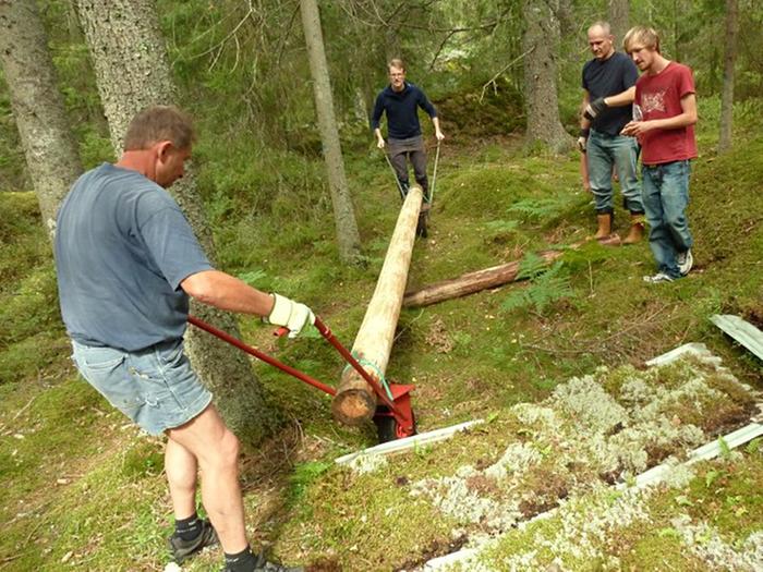 I came across this Swedish webpage where they detail the rebuilding of an earth sheltered building. They have several pictures of the devices that they used to move their new poles. It's like a wheel barrow without any kind of barrow, just the handles and wheels. What do you think it would be called? Does anyone read Swedish?