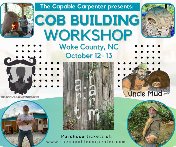 Join us the weekend of October 12th -13th for a hands-on cob workshop in Wake County, NC, where you'll learn all about working with cob, building a cob pizza oven, and incorporating cob techniques into restoring an ancient log tobacco barn. We'll have building demos, discussions on off-grid living and off-grid hot tubs, and plenty of opportunities to get your hands dirty. Plus, enjoy free van and/or tent camping on site. Don't miss out on this unique learning experience!