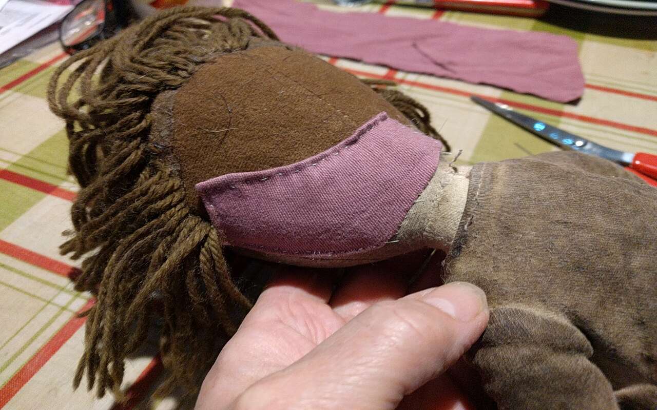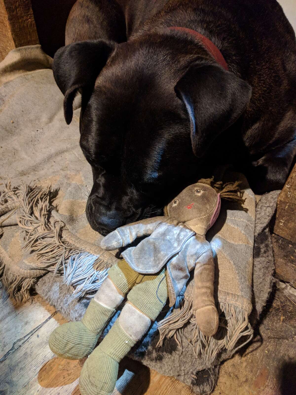 I made my mastiff very happy today by mending her dolly. Dolly suffered from a broken head a while ago and was put away for her own safety. Today she got a neck patch that ought to keep her playing for a little longer.
