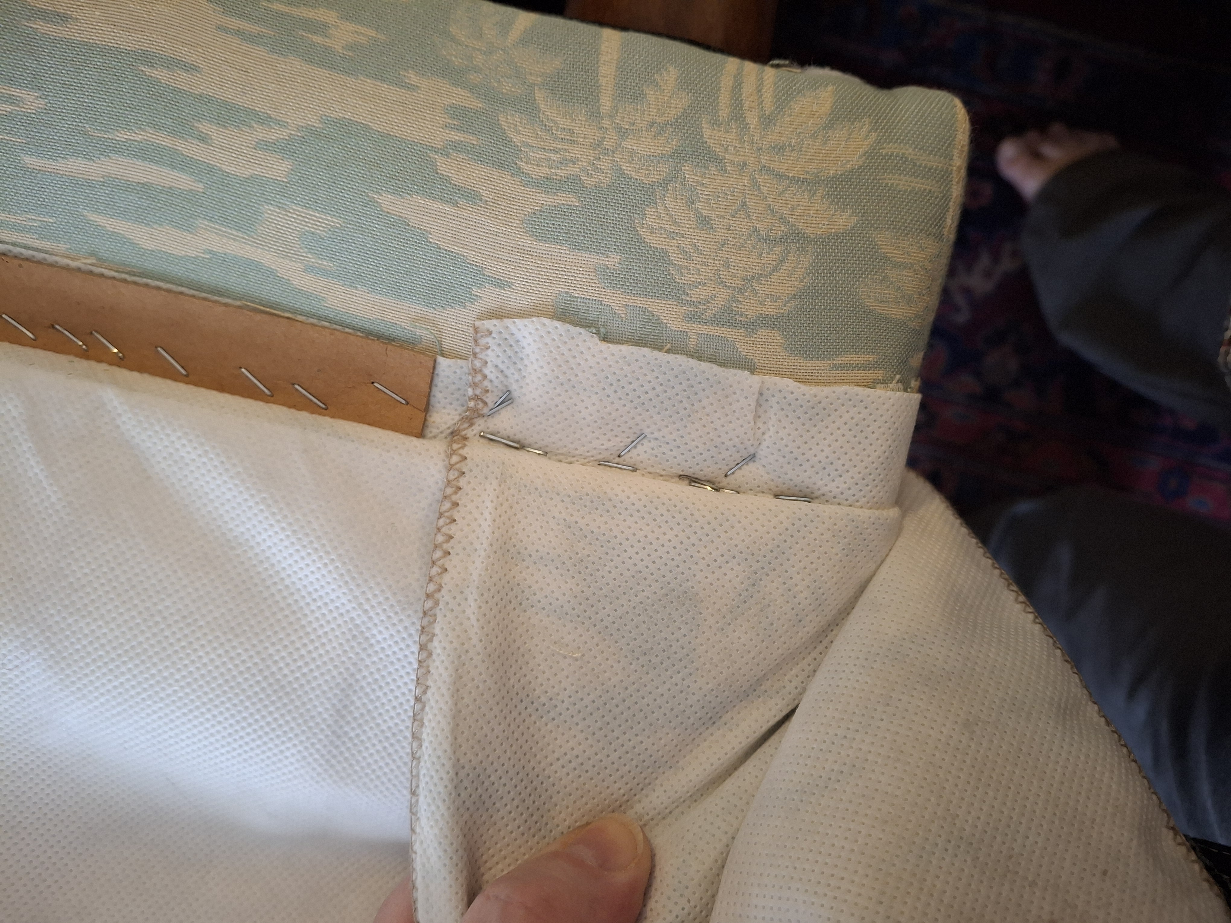 I took a good look at it and found out that the falls around the bottom are actually easy to get off. A bit of time with a flat screwdriver and a pair of wire cutters, I got them off and gained several pieces of intact fabric. They were washed and ironed.