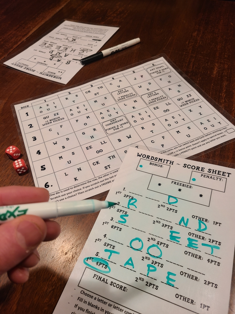 Wordsmith, which features dice-throwing, word spelling, and a few surprises sprinkled in there. A recent guest at