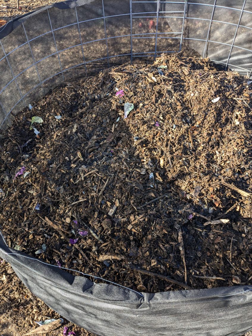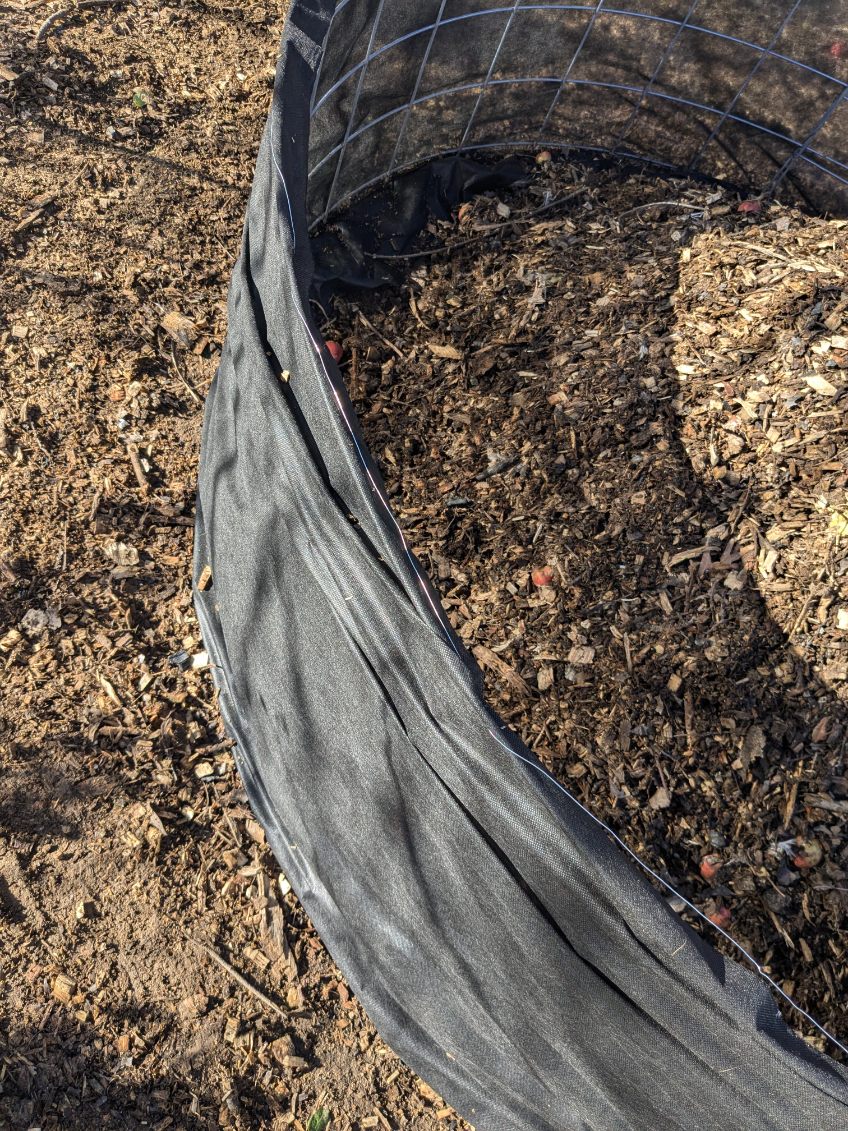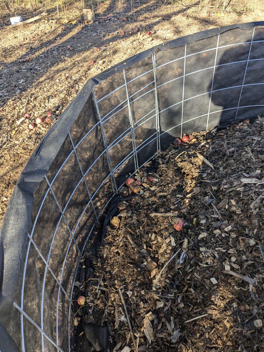 To build this I took a 16' cattle panel 50" tall and cut it the long way down the middle into pieces approx 2' wide. I made them into a ring with a couple squares overlapping so I could wire them together. I used weed cloth around the outside of it and wired on to hold the compost in place. I don't like weed cloth, but I haven't thought of an alternative yet.