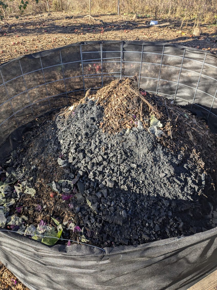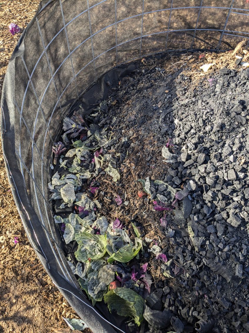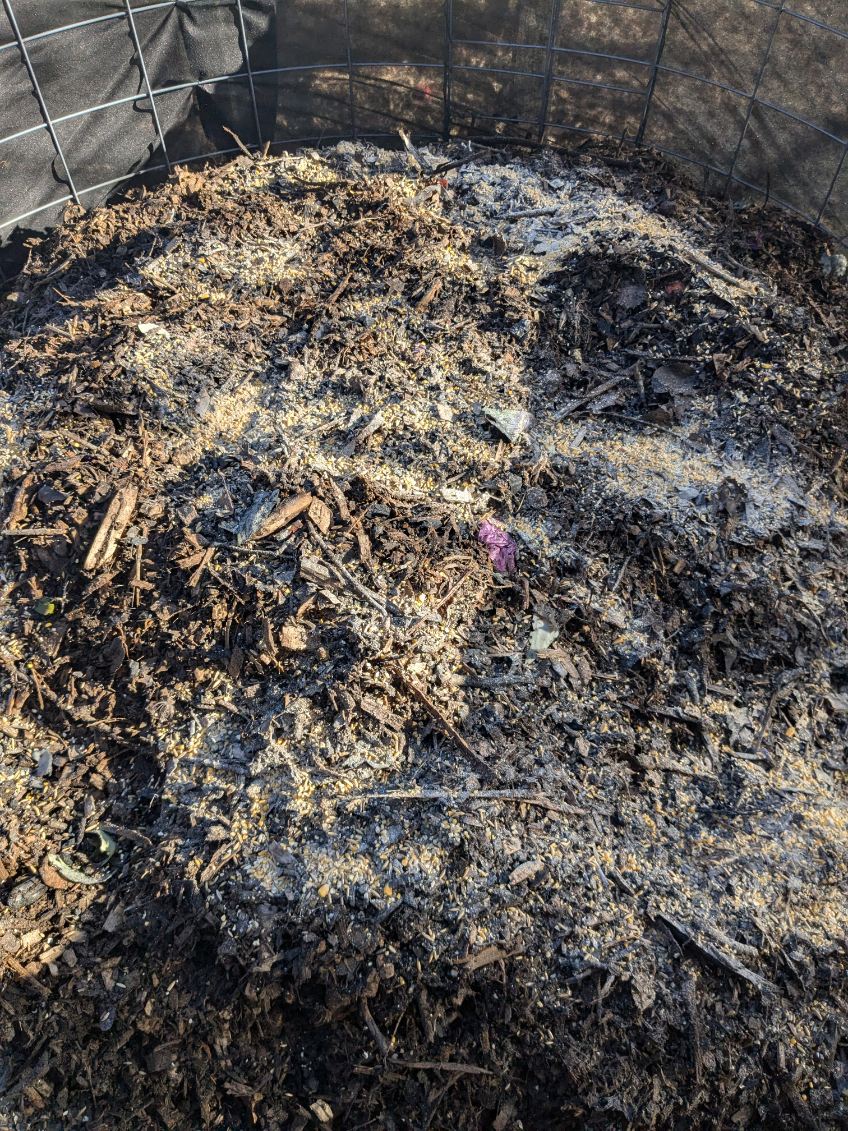 After building, I piled in woodchips, added some food scraps, added charcoal, turned it in gently, and then added some scratch grain to heighten interest.