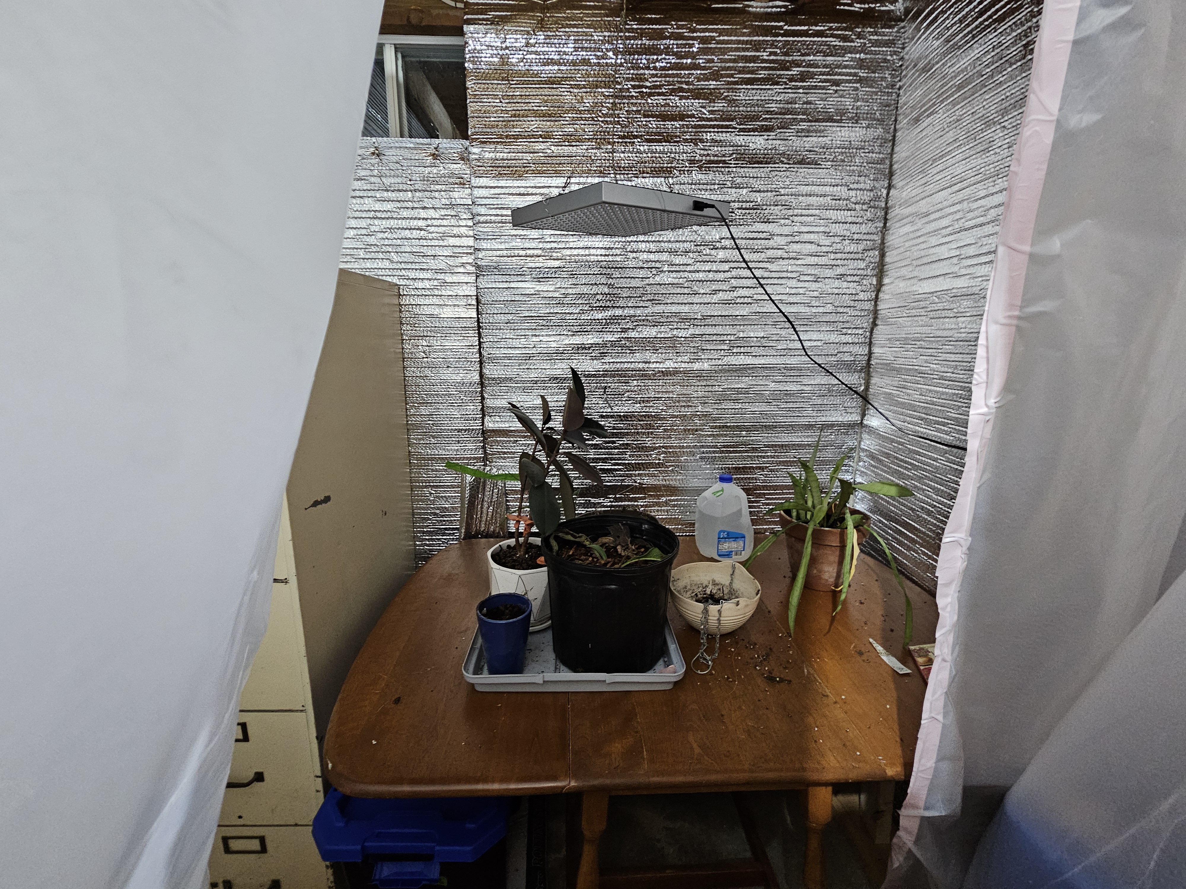 This year I'm upgrading to a 3'x5' table in the corner of a concrete basement, plus enough space to work while inside. I still have to figure out exactly what to do for walls, I am thinking of fastening mylar sheets to the concrete walls, and hanging blankets + plastic sheeting for the new walls, which I'll need to pass through to work. The room has a window, and I'm not sure how it'll behave when the cold dry winter winds meet the relatively insulated basement where I'm watering plants regularly under a grow light.