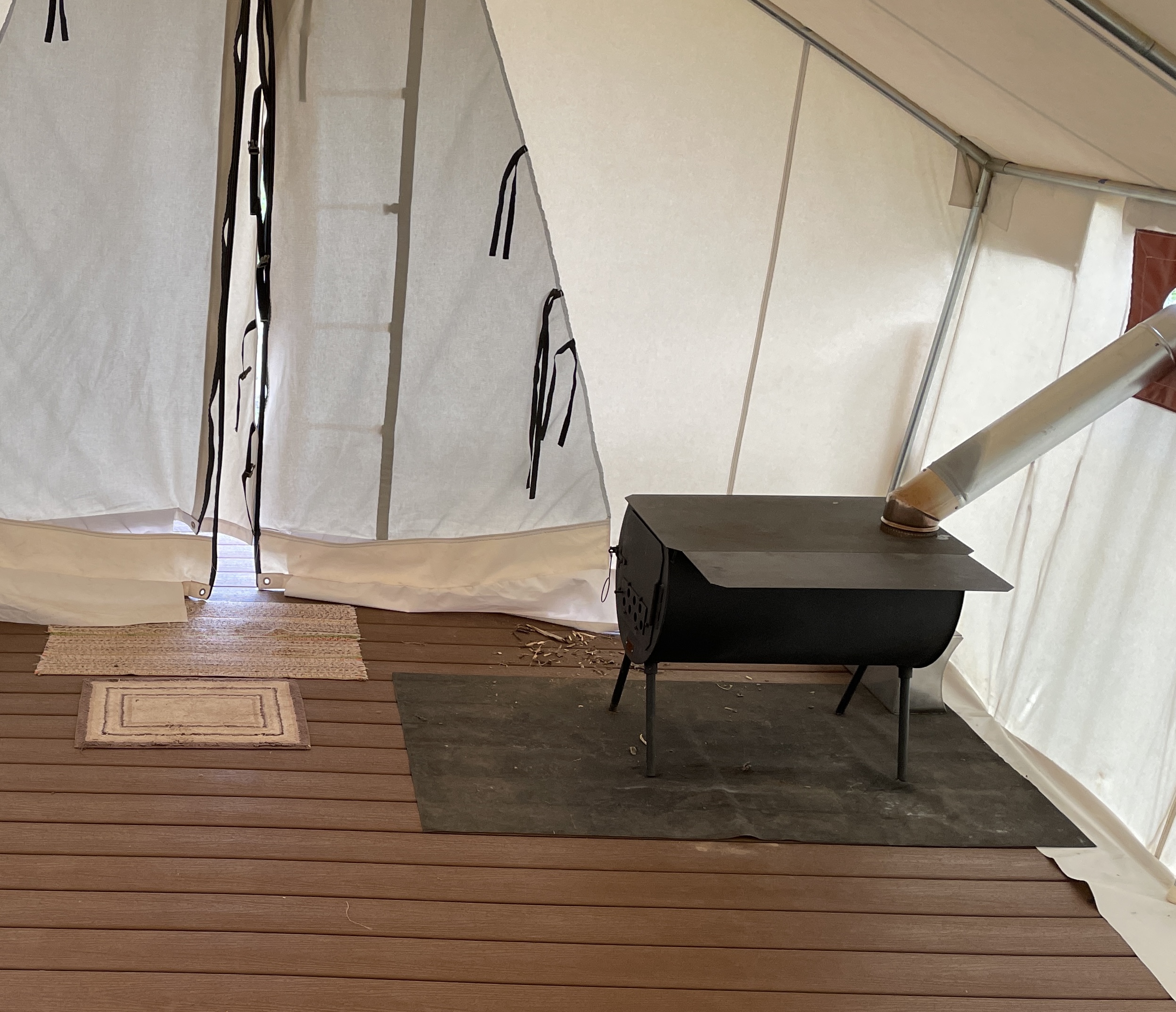 Here are a few pictures. I included the picture on the outside without the chimney so you can see how it's off the ground a little because of the deck the tent is on. I'm realizing looking at it now that those are probably 45 degree elbows by design that we're trying to get closer to 90 degrees in how we're using them and maybe we should go 45 degree straight out of the stove, through the jack, then another 45 degree outside, which I think is what Davis Tent actually intended.
