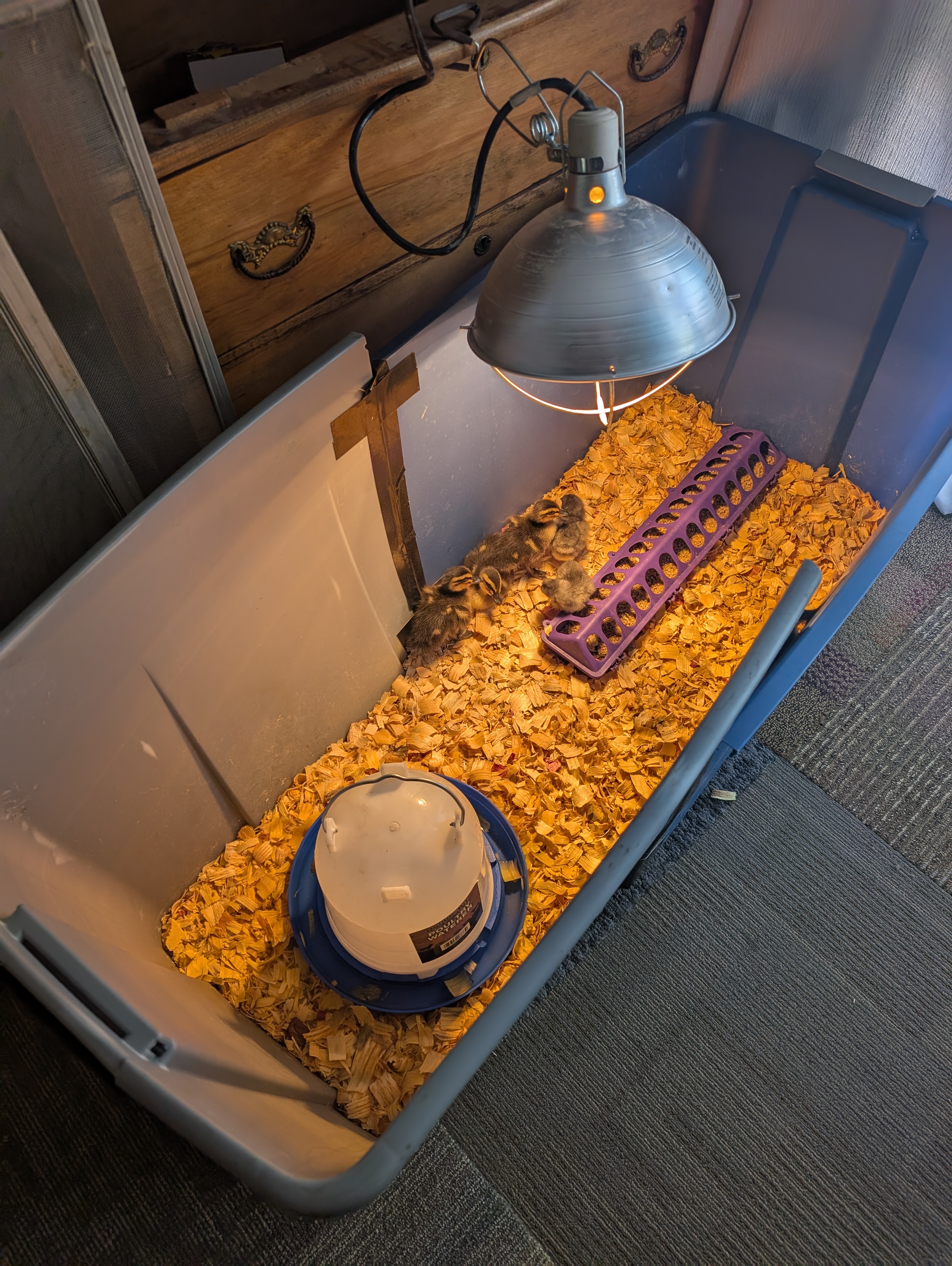 I got some babies today so figured I'd show my brooder. It's two Rubbermaids, taped together. Pretty fancy, right?😜 It cost exactly $0, though. I've had up to 18 Cornish cross chickies in here before with no issues. Currently holding 3 chickens and 3 rouen ducks. I'm not sure what I'm going through or do with the ducks, whether keep them for meat or eggs, but I've got a few weeks to figure that out. The girls desperately wanted ducks, so we got ducks.