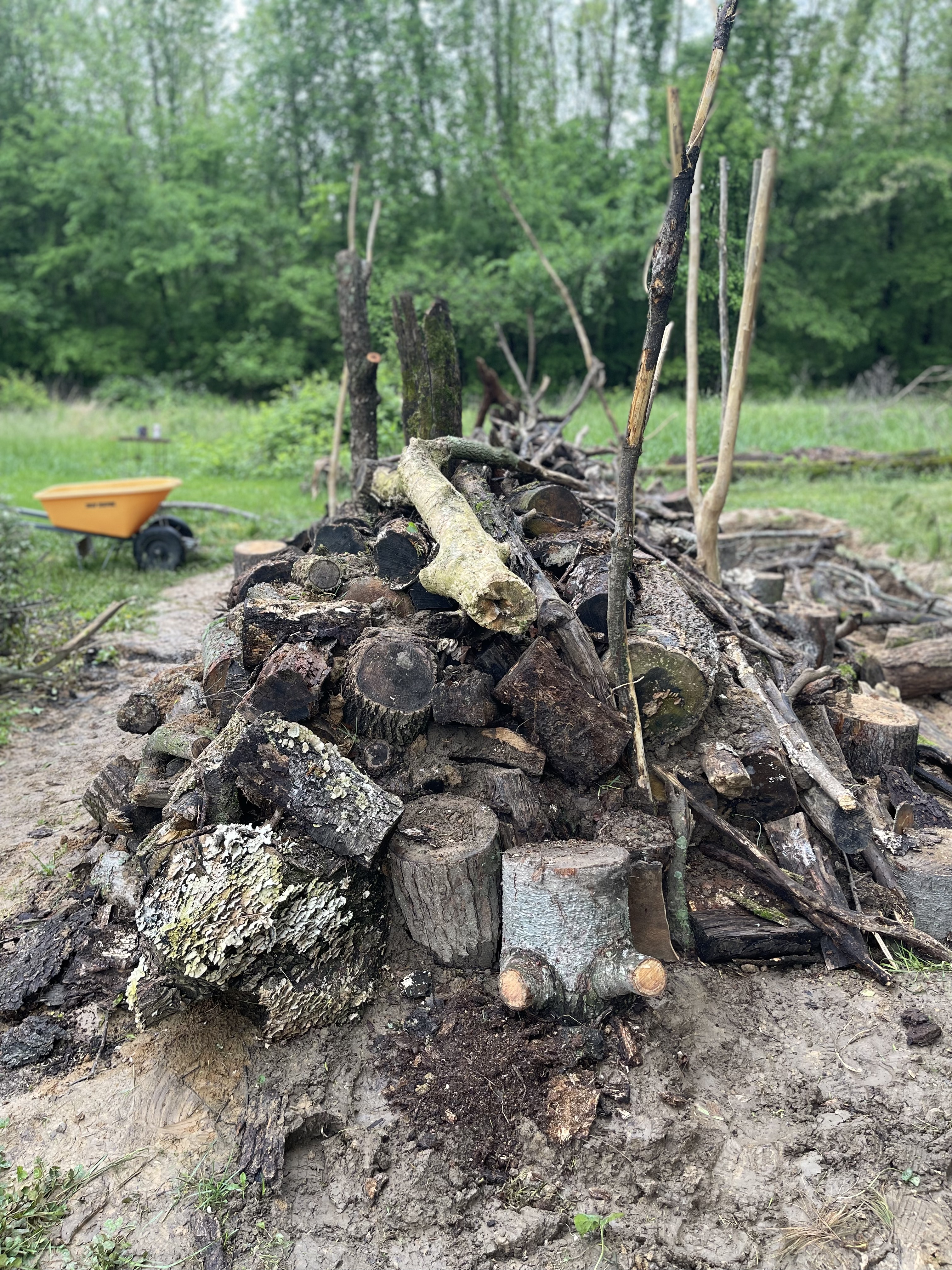 I have added pics of the wood piles. I suspect I've collected some local firs, especially the newr wood. But I'm really excited about all the logs I've gathered that are entirely fruited with mushrooms. I'm hoping these will accelerate the inoculation of the fresh wood in the mound. My goal is to try and get the mycorrhizal network fully throughout the wood in the mound as quickly as possible. I haven't seen anyone talk about this aspect, but I believe that's the a big reason the wood is able to act as a sponge. The mycorrhizal network would help bring nutrients and water into the growing zone of the plants on the mound.