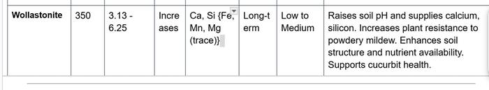 We confirmed that wollastonite has liming capabilities similar to regular limestone. Regardless of the application rates, wollastonite and limestone showed similar effects on soil chemistry and plant mineral composition. Pumpkin plants grown with the lower doses of wollastonite amendments (3.13 and 6.25 tons/acre) had the greatest tissue Si concentrations and demonstrated the greatest disease resistance. We conclude that wollastonite is a useful material for organic cucurbit (Cucurbitaceae) growers who want to increase soil pH and improve plant resistance to powdery mildew at the same time. Applying wollastonite at rates beyond the amount required to achieve a desirable soil pH for pumpkin production did not further increase Si uptake, nor did it further suppress powdery mildew development"