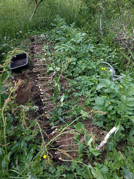 I tucked it back in and expect it will be OK. Maybe the beans will feed the asparagus a little. After watering in the beans I poked in some hazel sticks as a trellis for the beans to climb up. The sticks are not very tall, and I tied them together with an old bamboo cane.