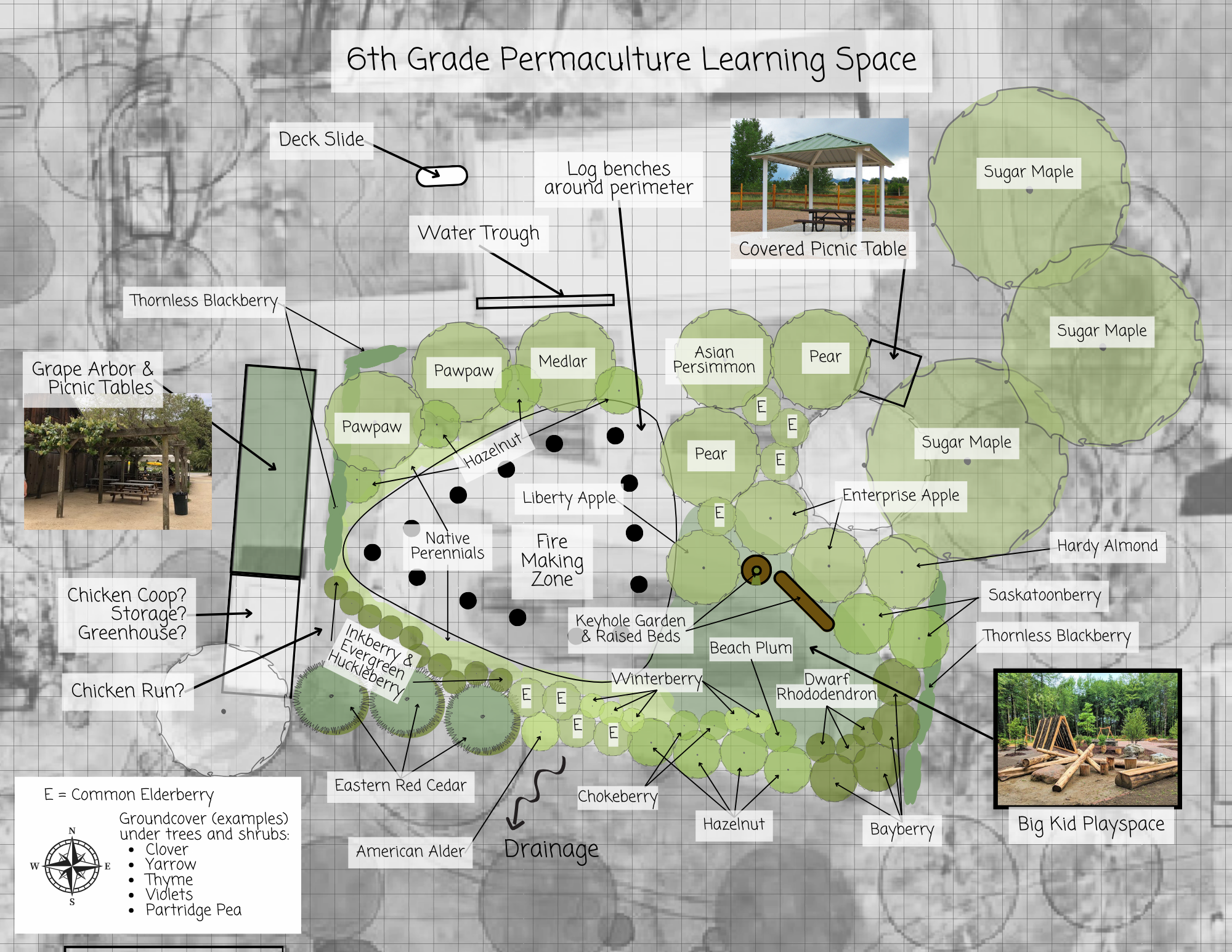 Very cool plans. I love conifers and as a westerner I do not know much about eastern red cedar, but I might consider a deciduous tree instead in the SW corner to shade in the summer but not block winter light. Maybe trade its spot with the sugar maples in the NE corner? At a food forest I designed for a school, we put thimbleberry around the outdoor classroom, as kids like its berries and lovely soft leaves, which are also a great for them to learn for using the facilitrees when needed out in nature.