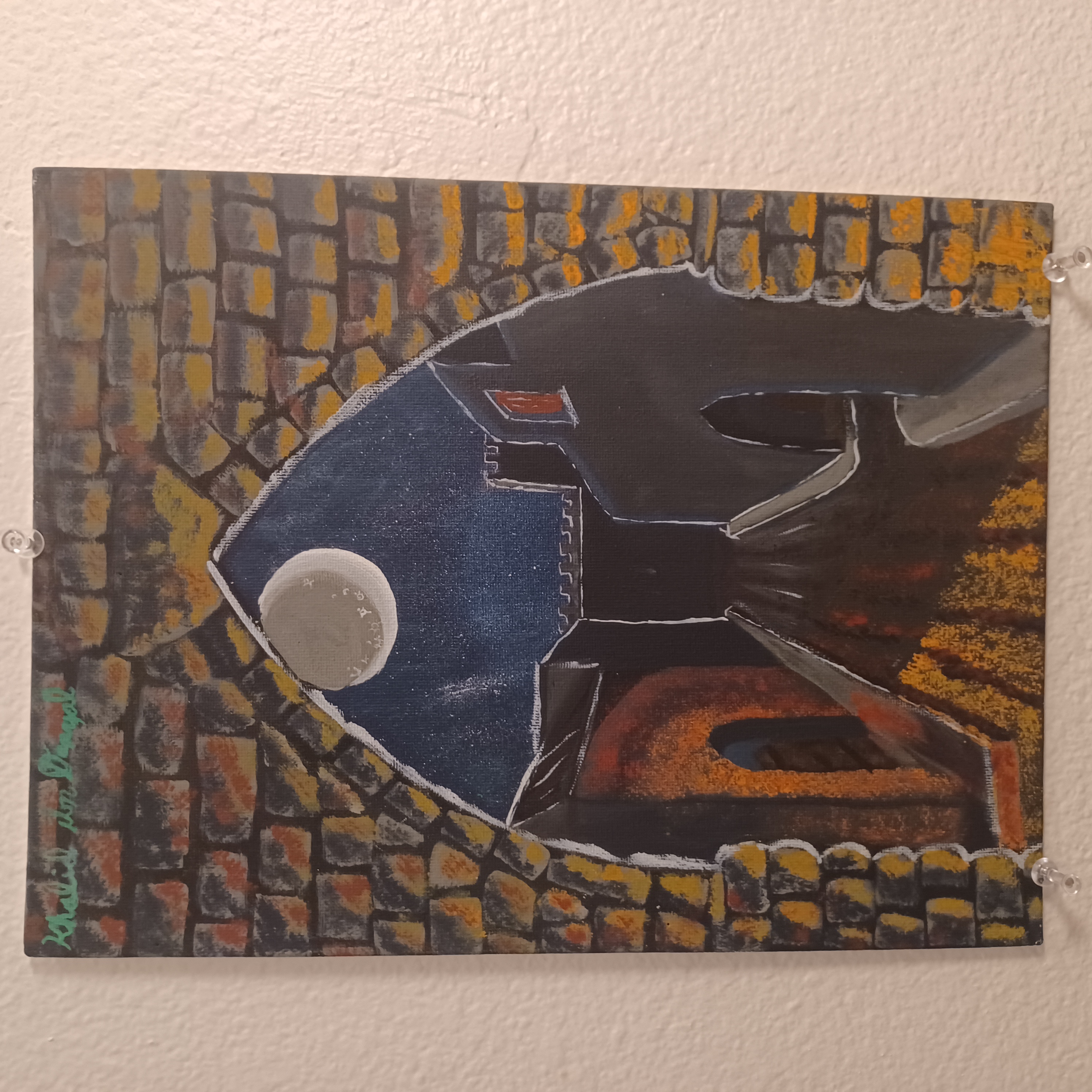 In color block, you paint background colors or the gist of a painting in large blocks of color to avoid needing outlines. So first draw on the canvass with pencil, then paint the different areas of the major colors, then paint in details over it. It starts with an unprimed canvass. The reverse shading is when, as in the stone arch below, the mortar color in shadow was painted first, then the blocks of stone were painted over it. This comes from people who paint miniatures. Then I textured the stones by sponging the light reflected off of them in on the shapes of the stones.