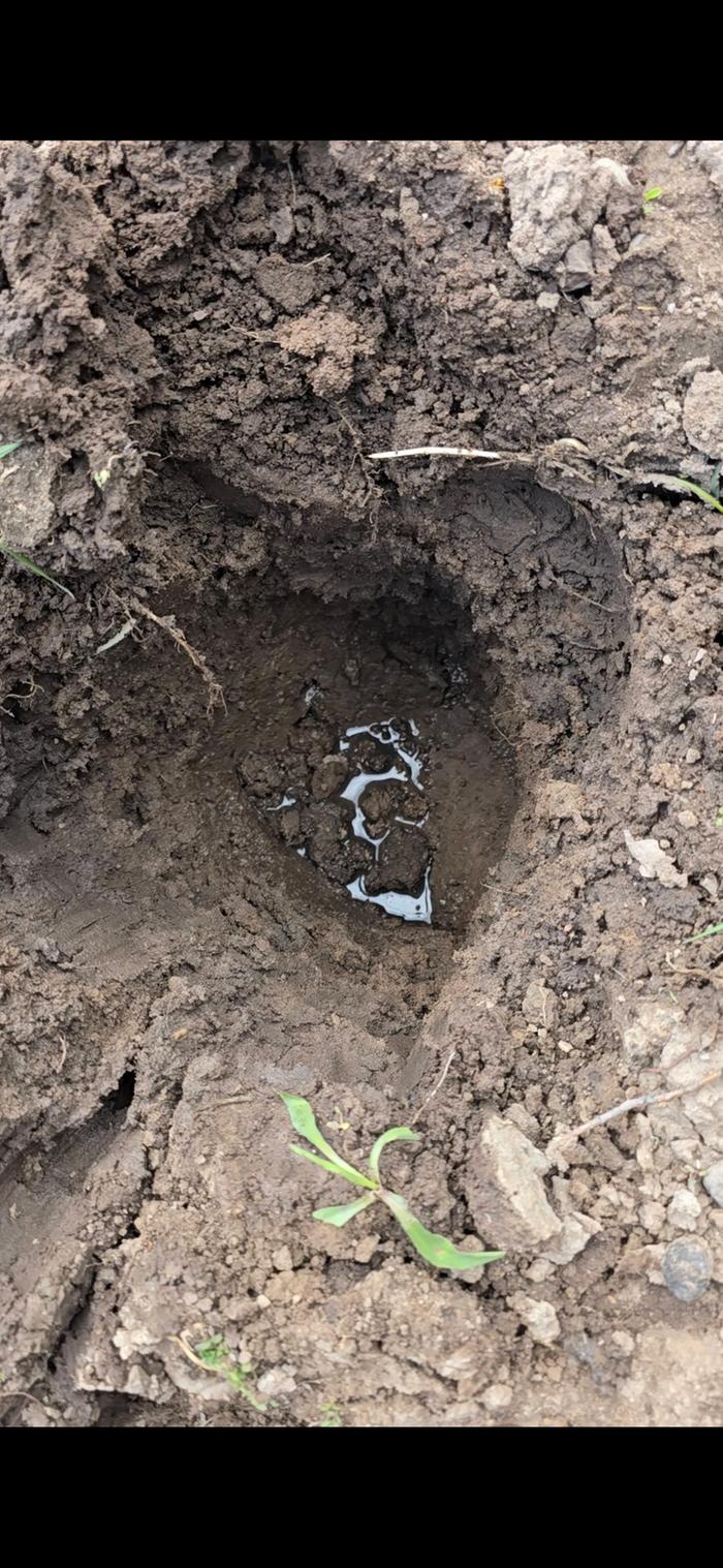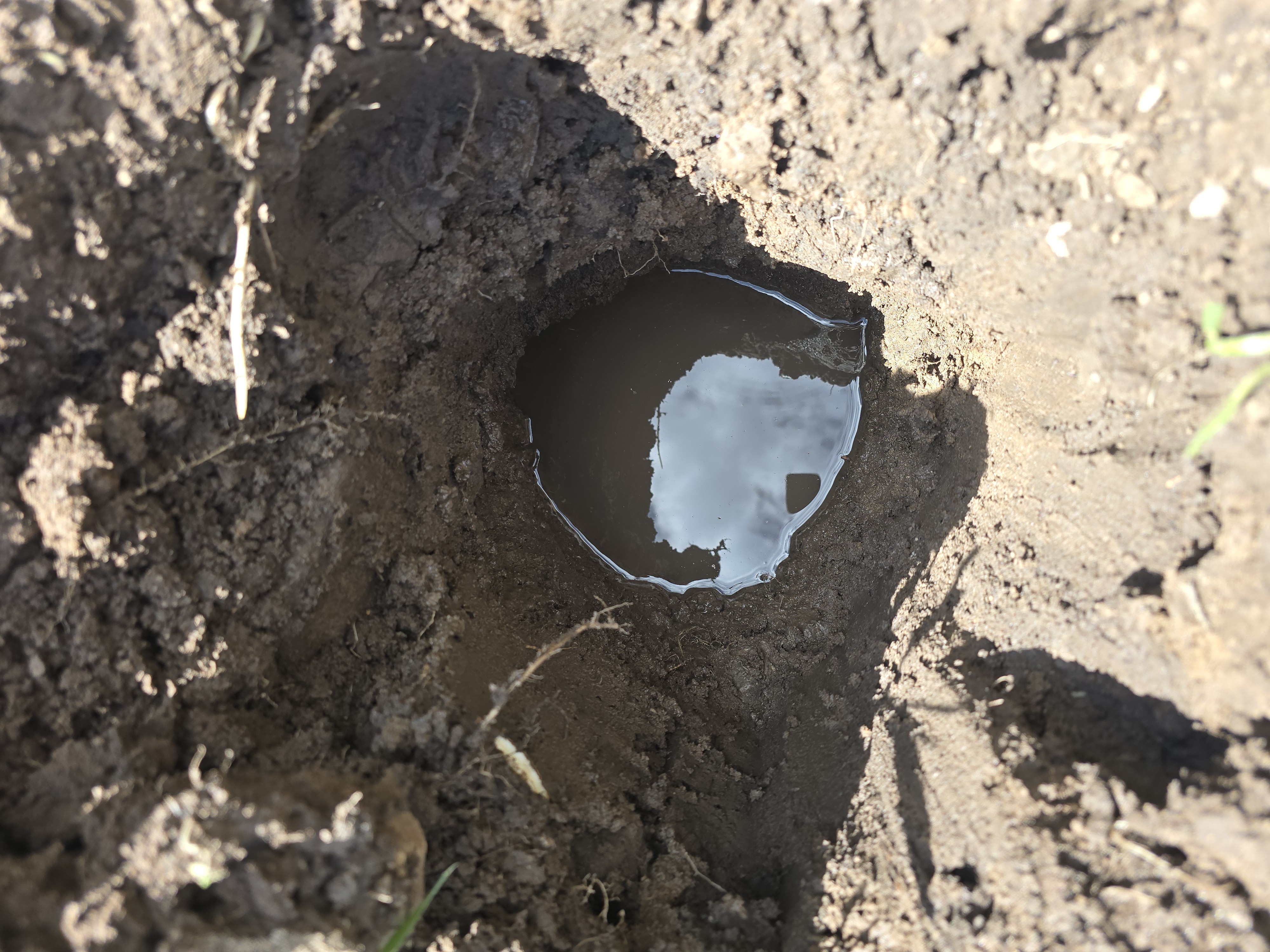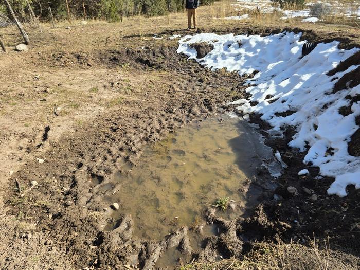 I recently had a livestock pond developed to capture rain water and run off during the spring season. Upon doing that, we discovered a year round wet spot in the tank. Yesterday, I dug in to the top side of the dry pond and hit soggy mud 12 inches down. The shovel hole filled to about 4 inches of water in less than 5 minutes. I'm attaching pictures for reference.