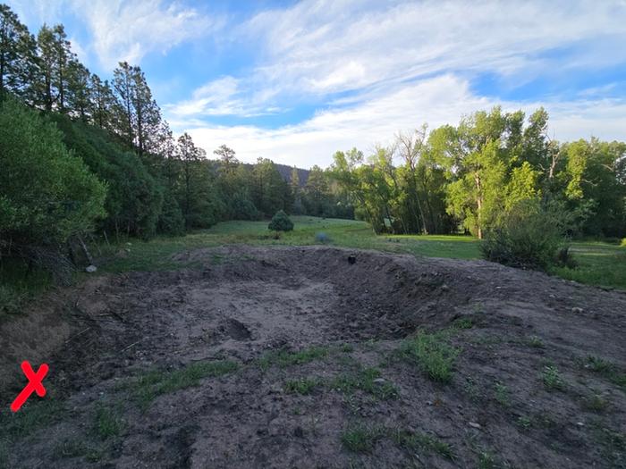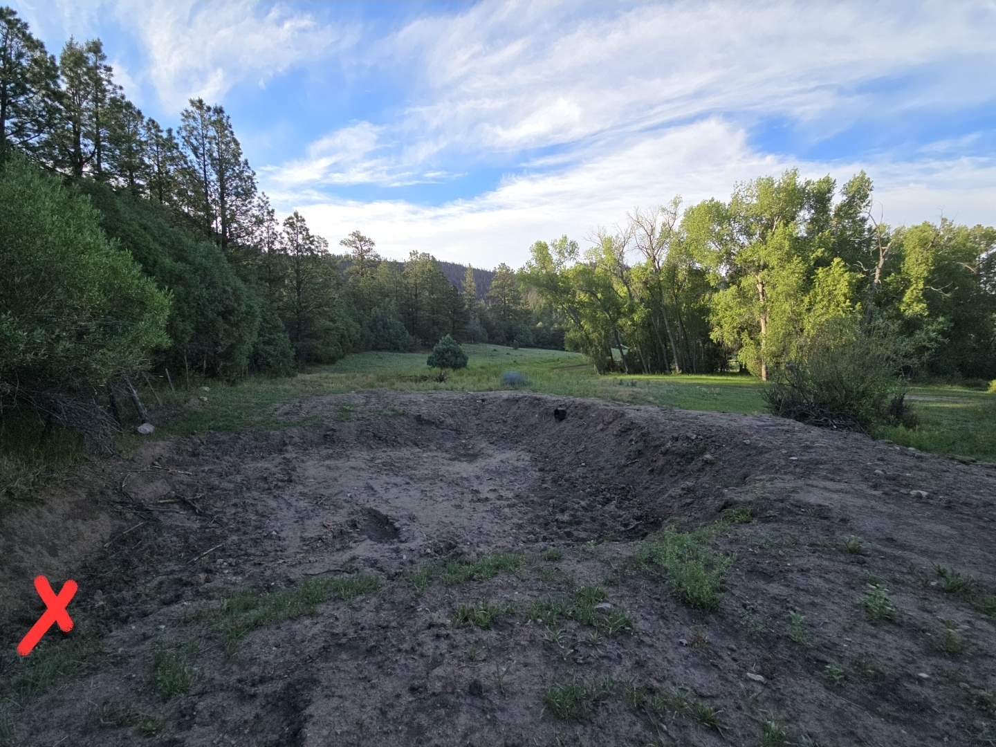 The shovel hole I dug on the wet spot is marked in the vicinity of the red X
