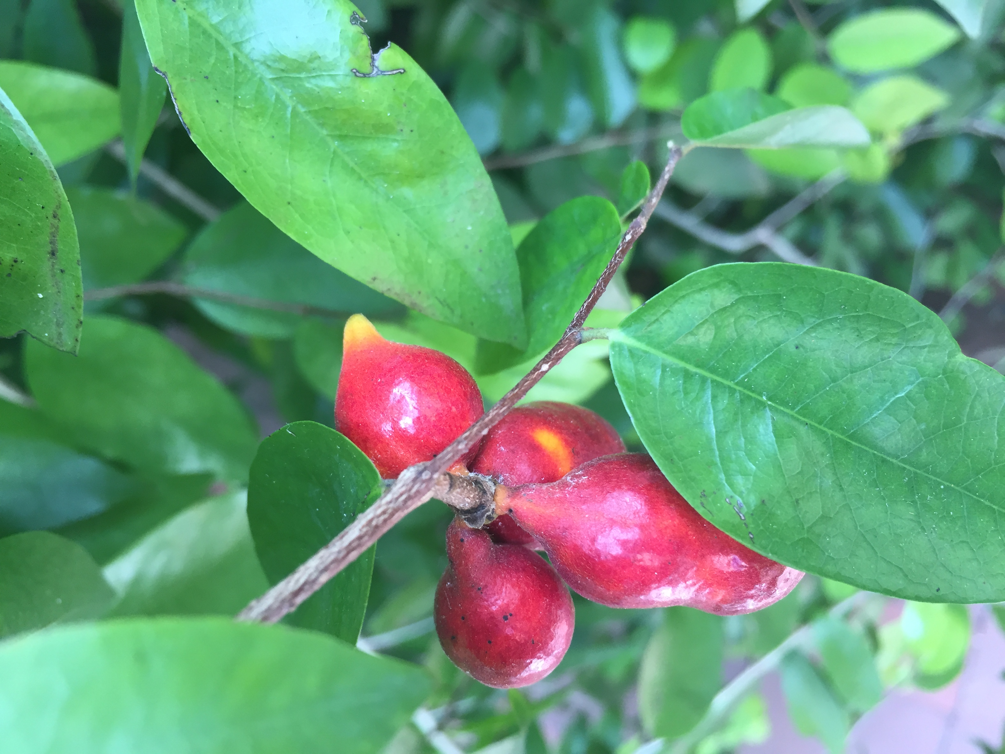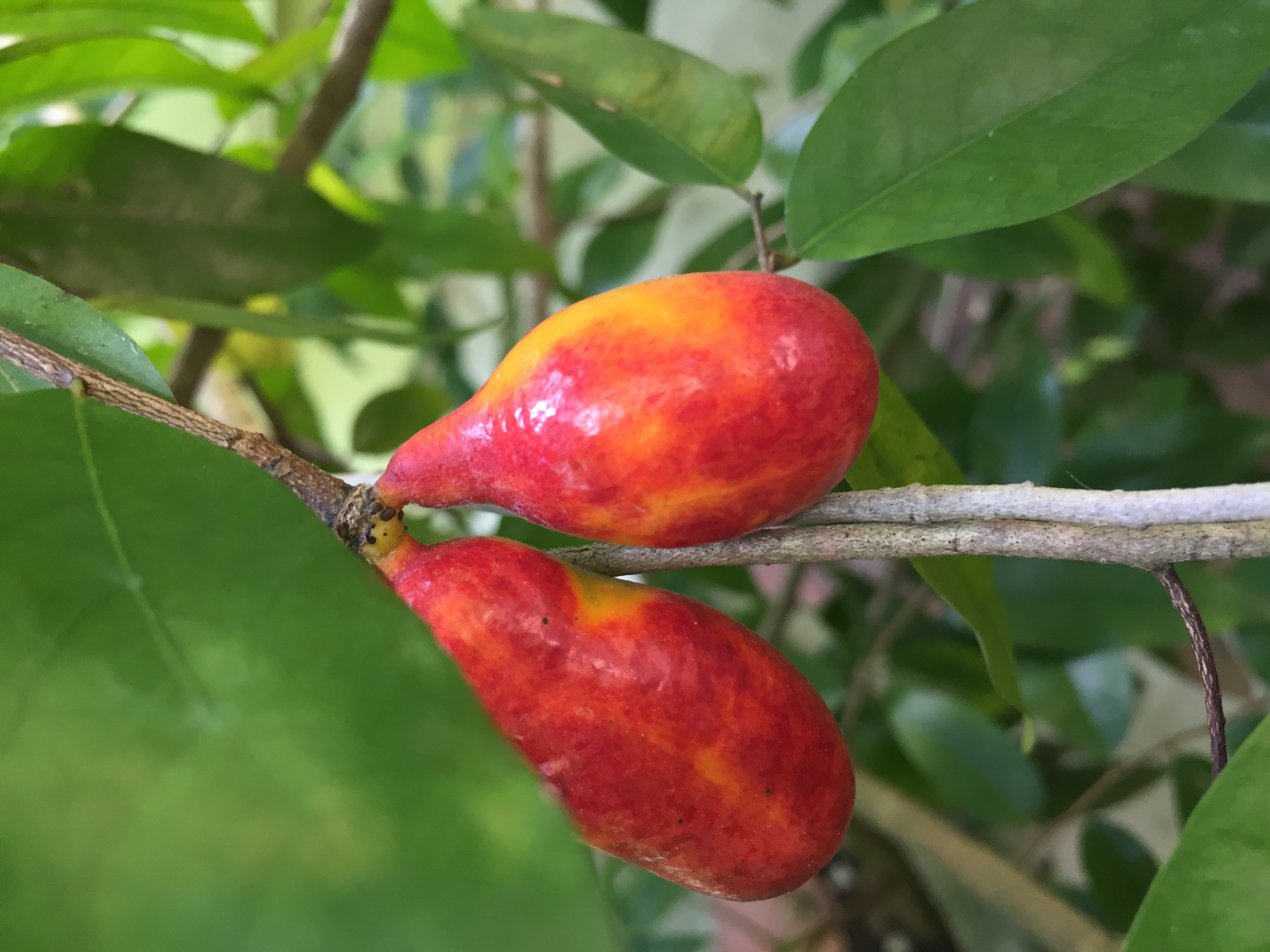 Thanks so much for taking your time to reply. The flowers must be unremarkable because I've never noticed them. The mature fruit is in the picture with the pear-shaped double fruit. I did not open them up to see seeds, and I didn't get a picture of the bottom of the fruit, sorry. It is definitely not a pomegranate– those leaves are not so smooth and pointy. It is also not a Miracle fruit.
