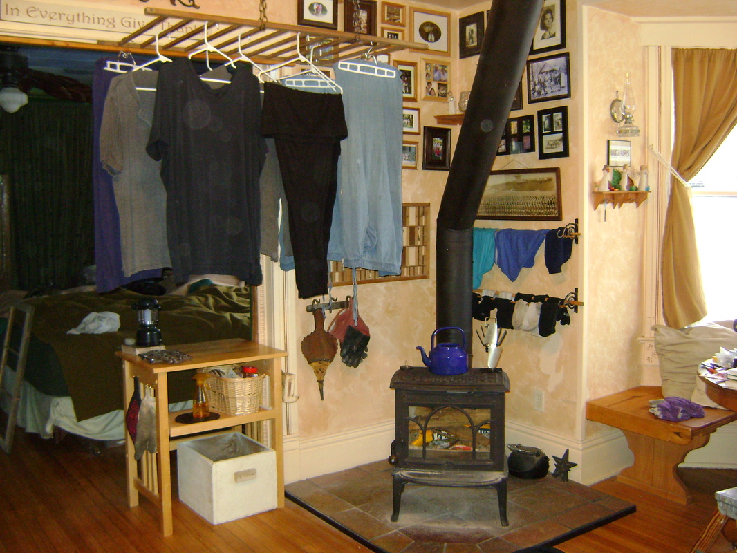 Do not use elastomeric paint above a wood cookstove, especially where food is drying. It poses a heat and toxicity hazard. Use heat-rated paint or a non-combustible barrier instead.