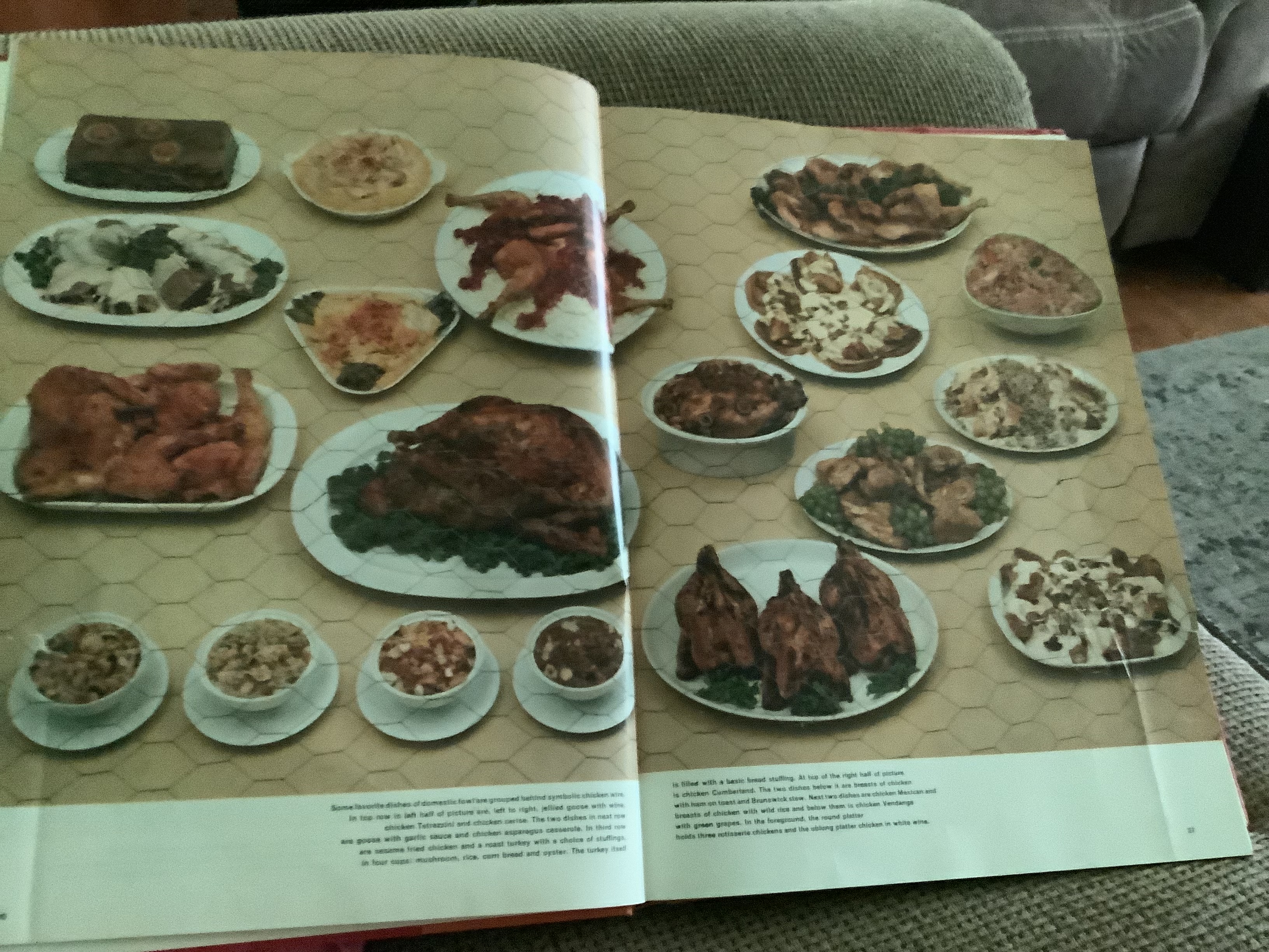 I opened it at random, to Fall Salads. Recipes for Fennel Slaw (fennel, celery, apple), Veggie Slaw (cabbage, broccoli, cuke. celery, snap peas, green pepper, scallions),Rainbow Salad (beets, red cabbage, green cabbage, pears, parsley or mint), Apple Walnut Salad (romaine, spinach, onion), Carrot & Cashew Salad (jalapeno, cilantro, carrot), Confetti Spaghetti (asst. fresh/froz. veg: tomato, celery, onion, cuke, radish, carrot, gr bean, corn), Kale & Lentil Salad with Apricot Vinaigrette (kale, cabbage), Corny Veggie Salad (broccoli, cauliflower, scallions, corn), Potato & Cauliflower Salad (cauliflower, potato, scallions), and Greek Chicken Salad (tomato, letttuce).
