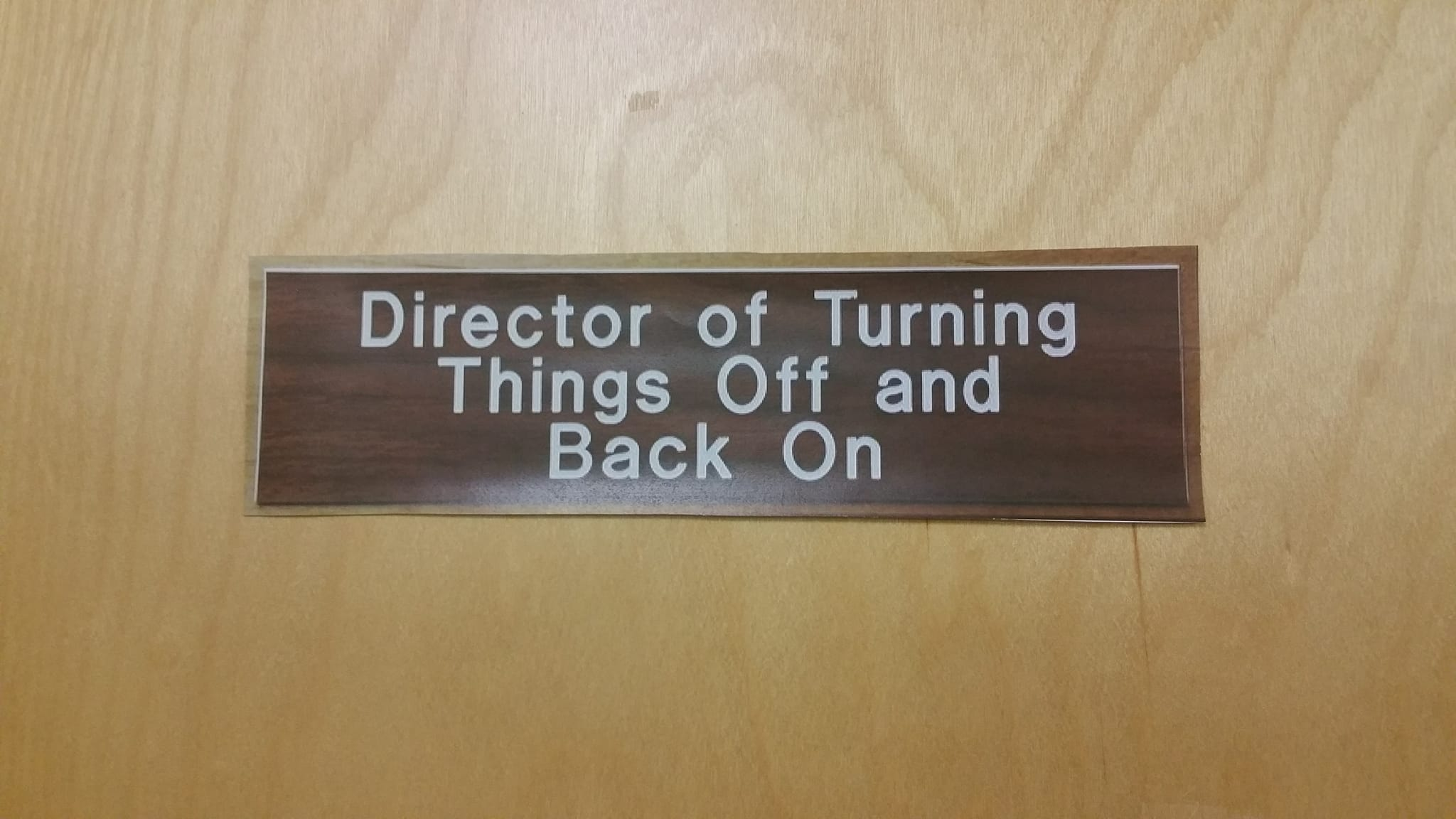 Jane Mulberry wrote:My guess is IT helpdesk, as that is always what they say. Even when you tell them you already did turn it off and back on.