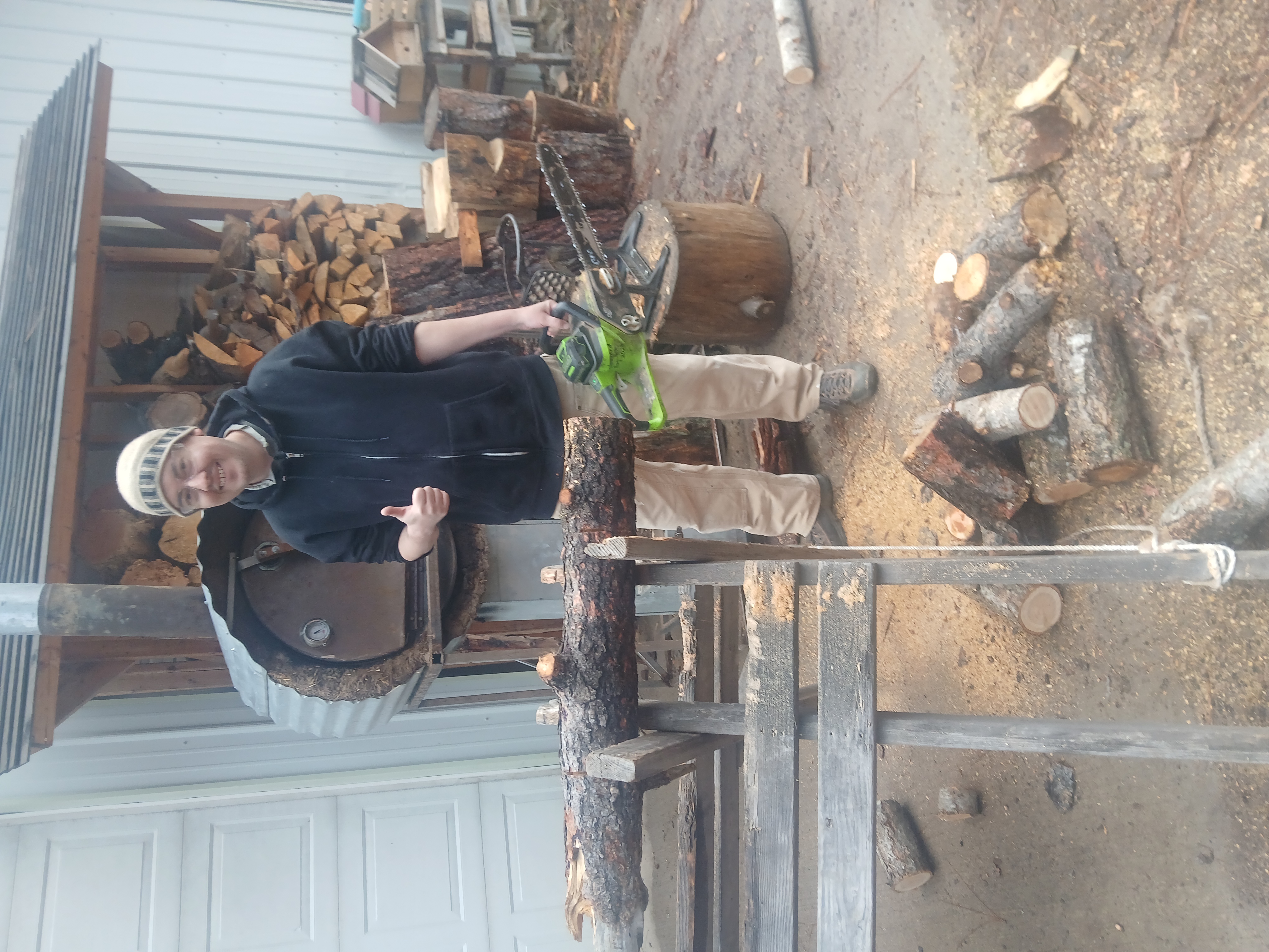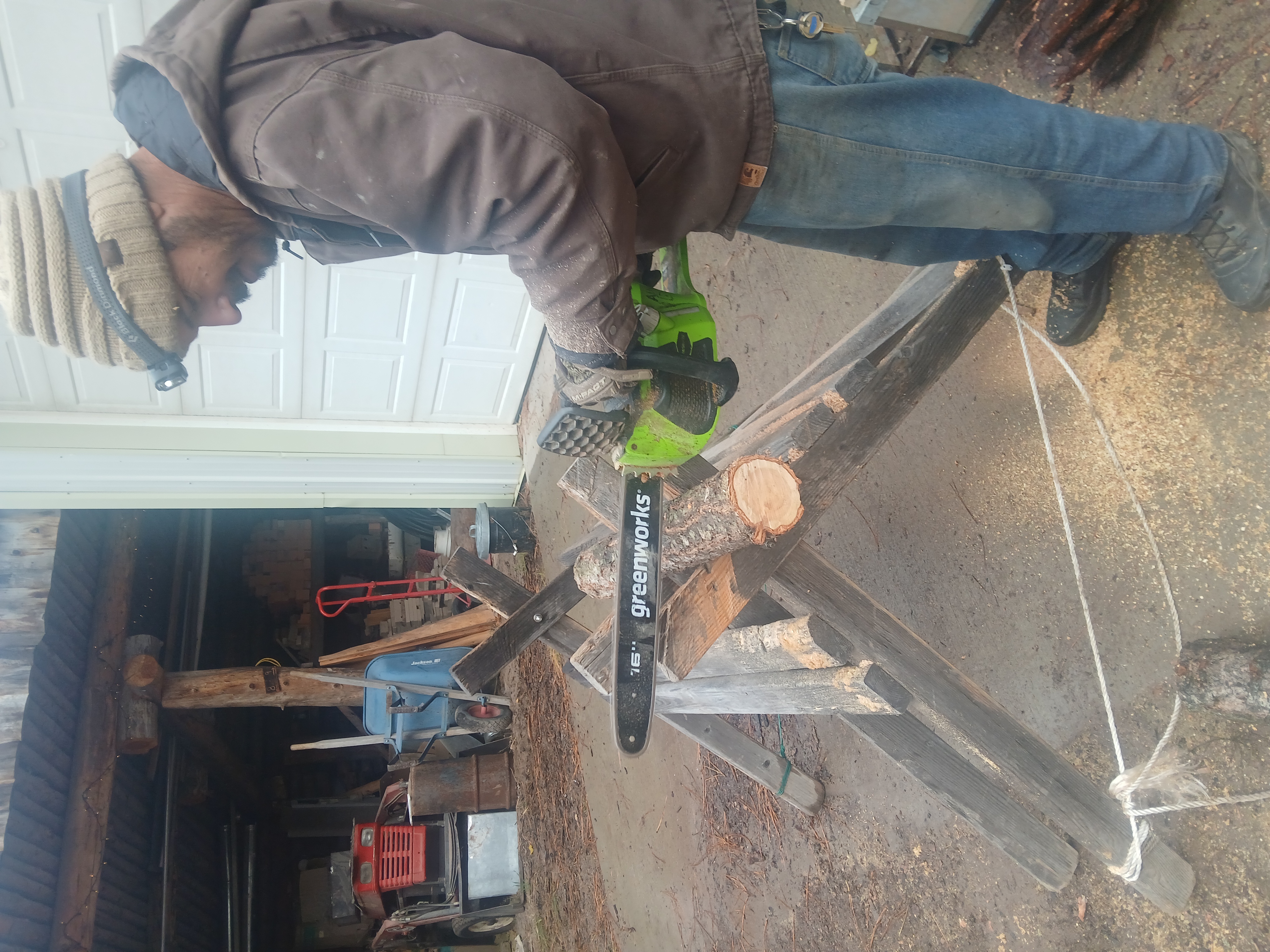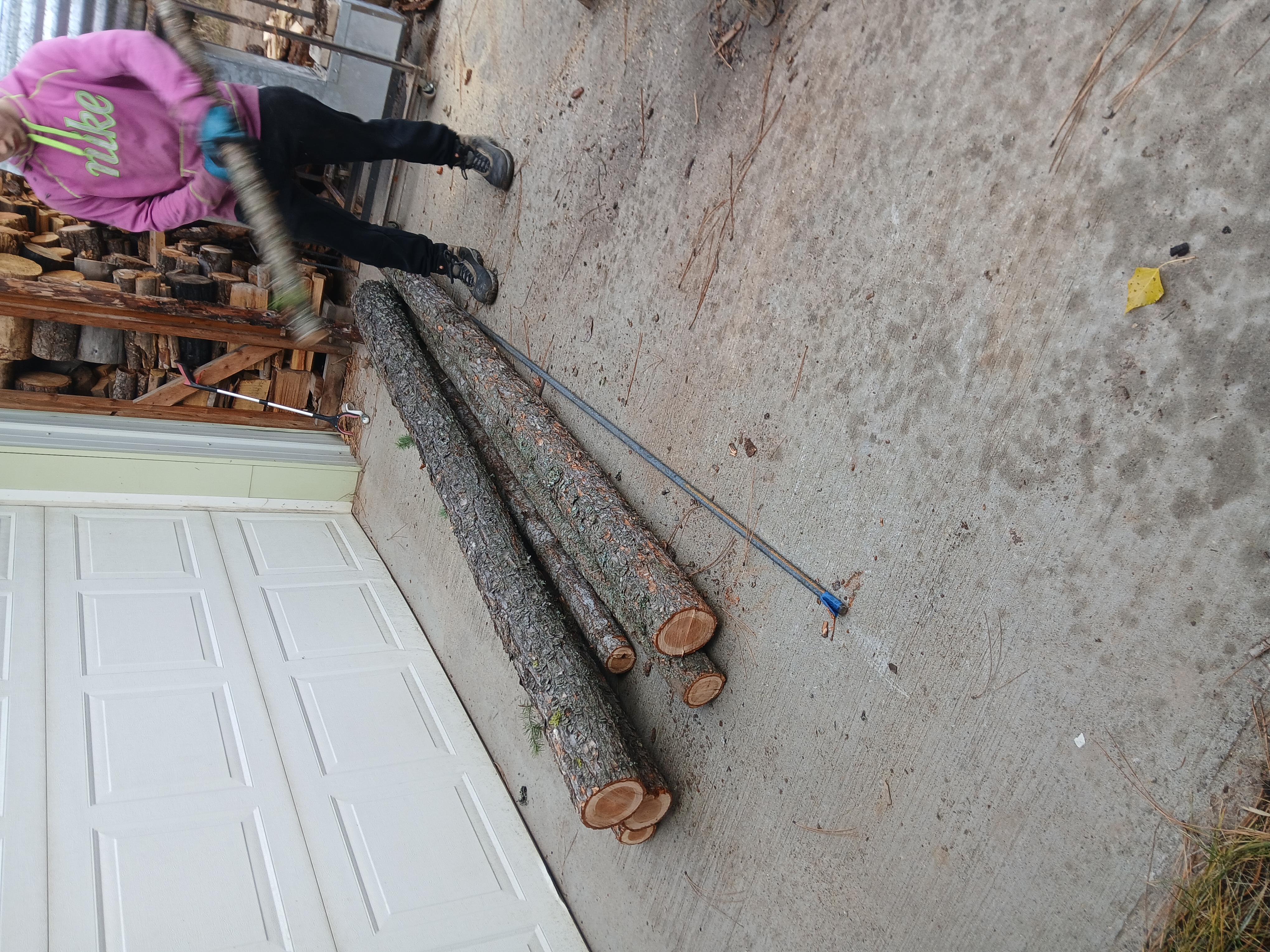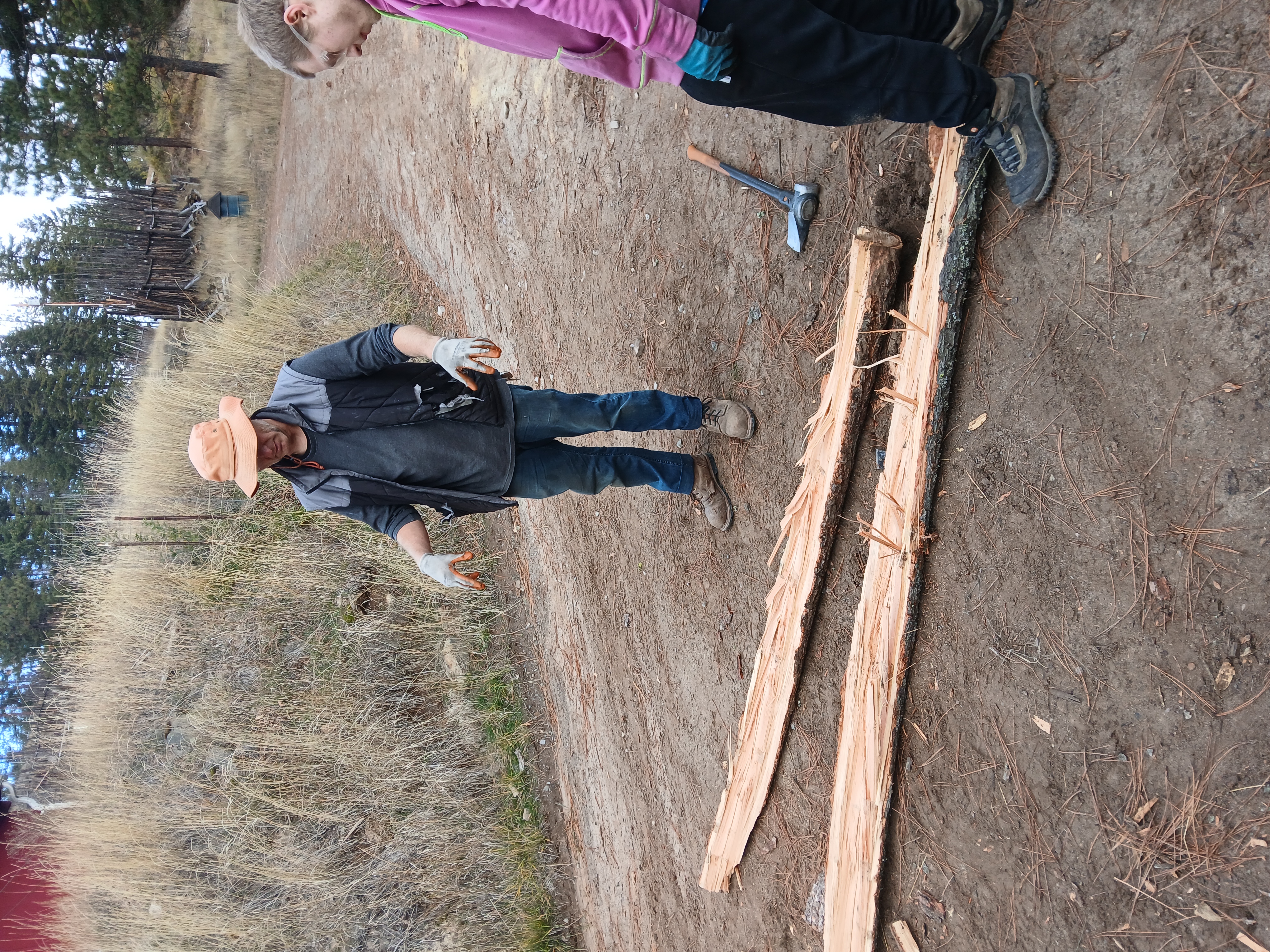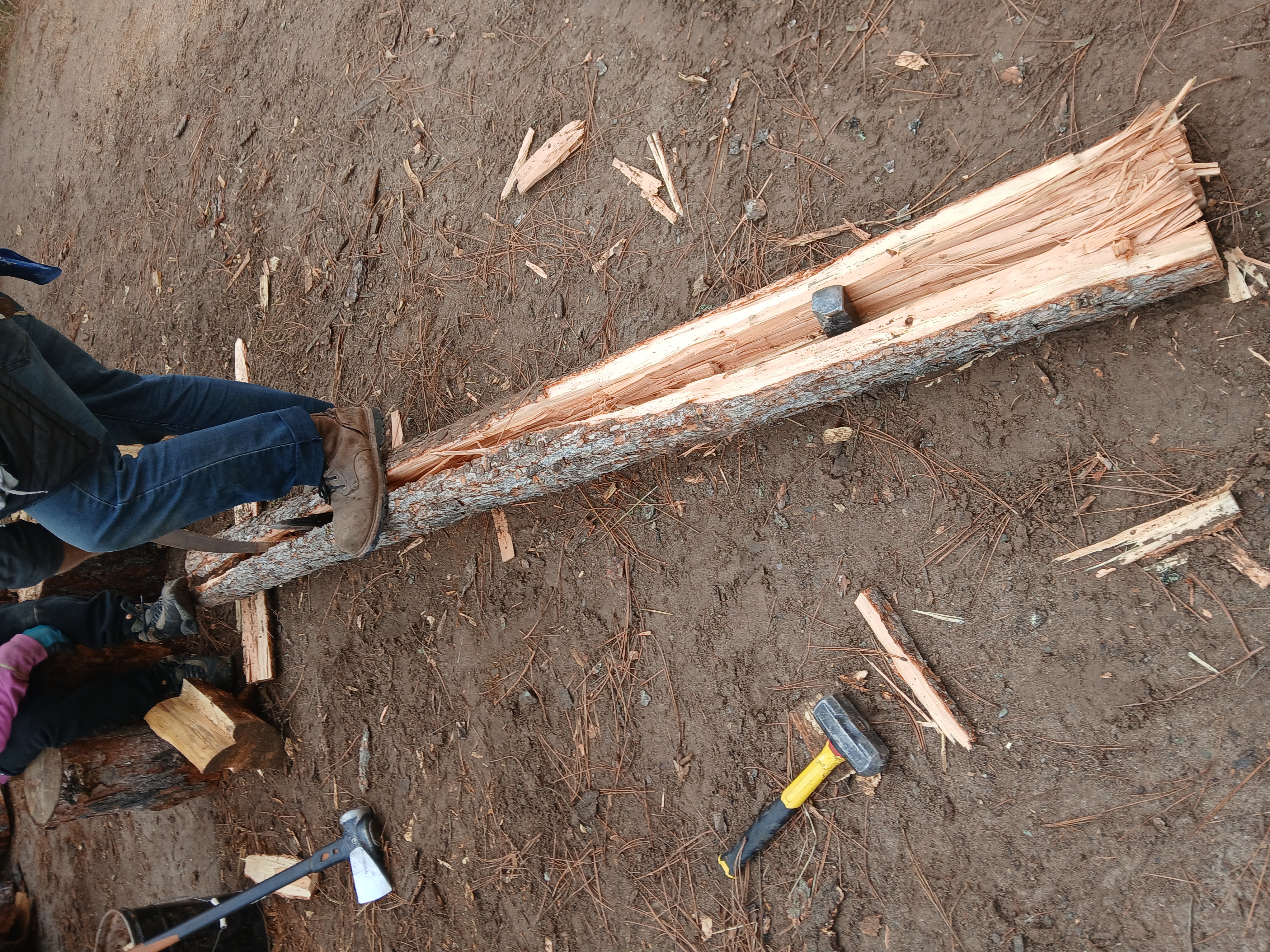 Back at Basecamp, we got to work cutting a couple more trees to use as material for the lean-to shed. Before we could start building, we split the 8-foot sections in half, loaded them up, and headed up the property. We spent the next stretch putting the lean-to together—solid progress and it’s coming along nicely.