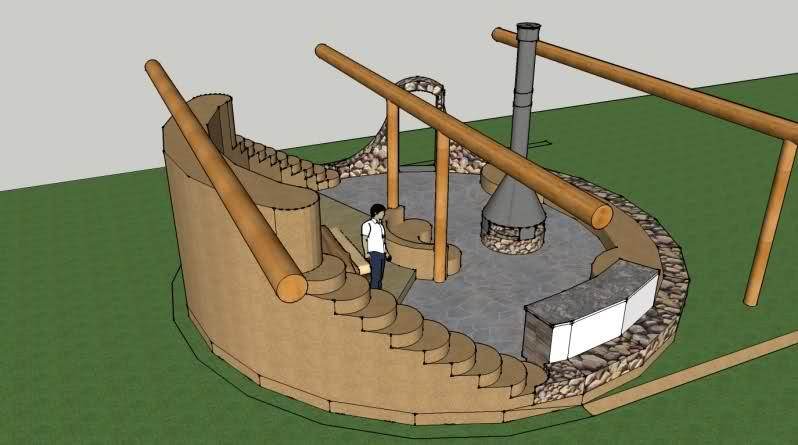 The kitchen will have a cob oven and a wood burning veggie grill. It will also have a compact rocket stove for water boiling and grain cooking.