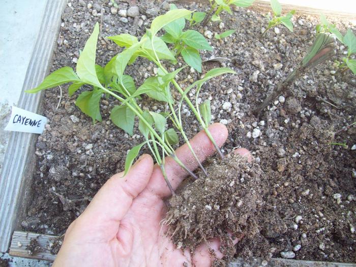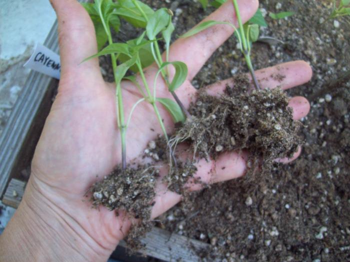 I think your question has been answered but since I was transplanting cayenne peppers today for market I took a couple pictures. I am late transplanting them...they are larger than when I usually pot them.