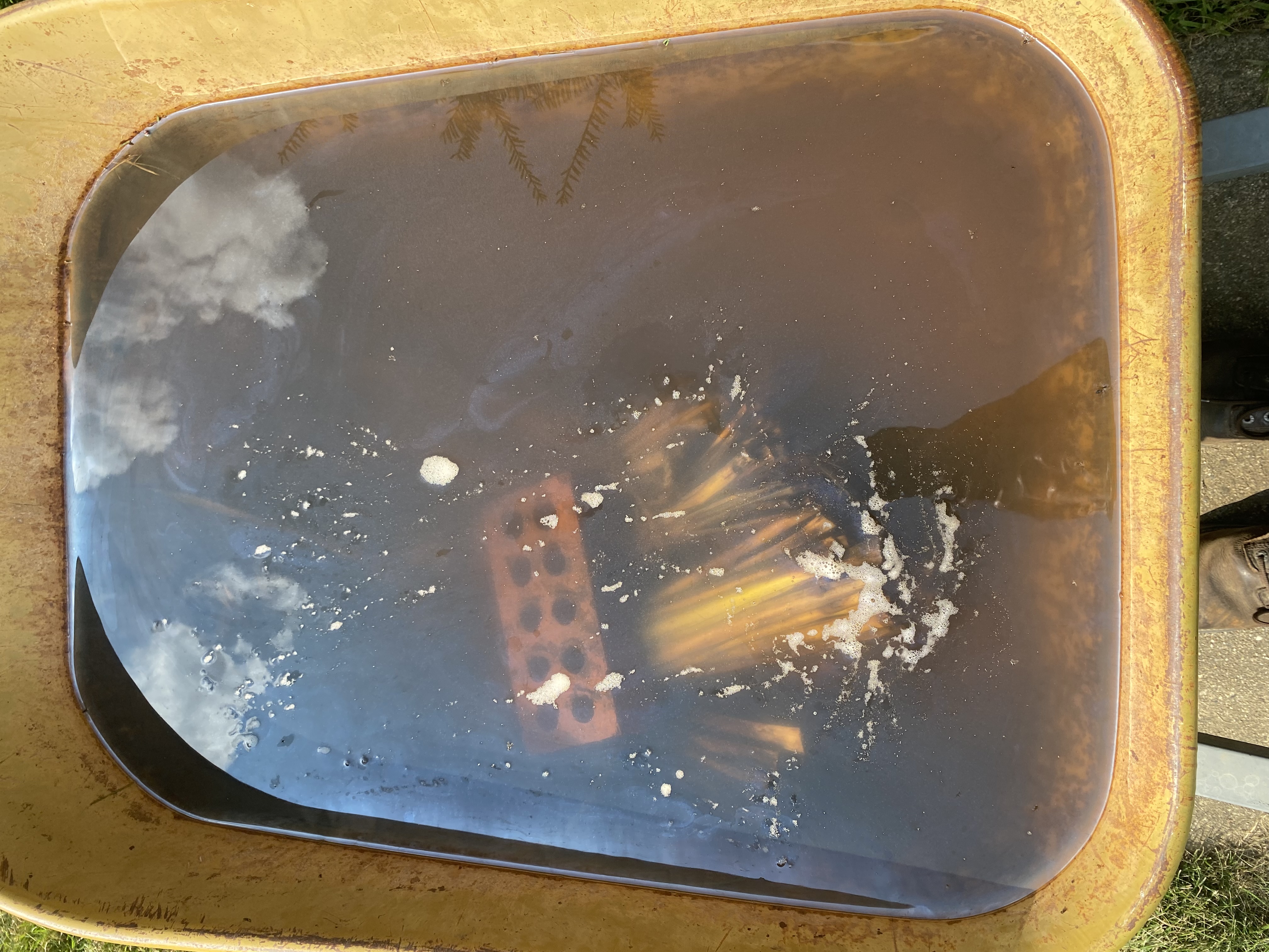 The yucca leaves retting in a wheelbarrow. Note the sulfurous gas bubbles.