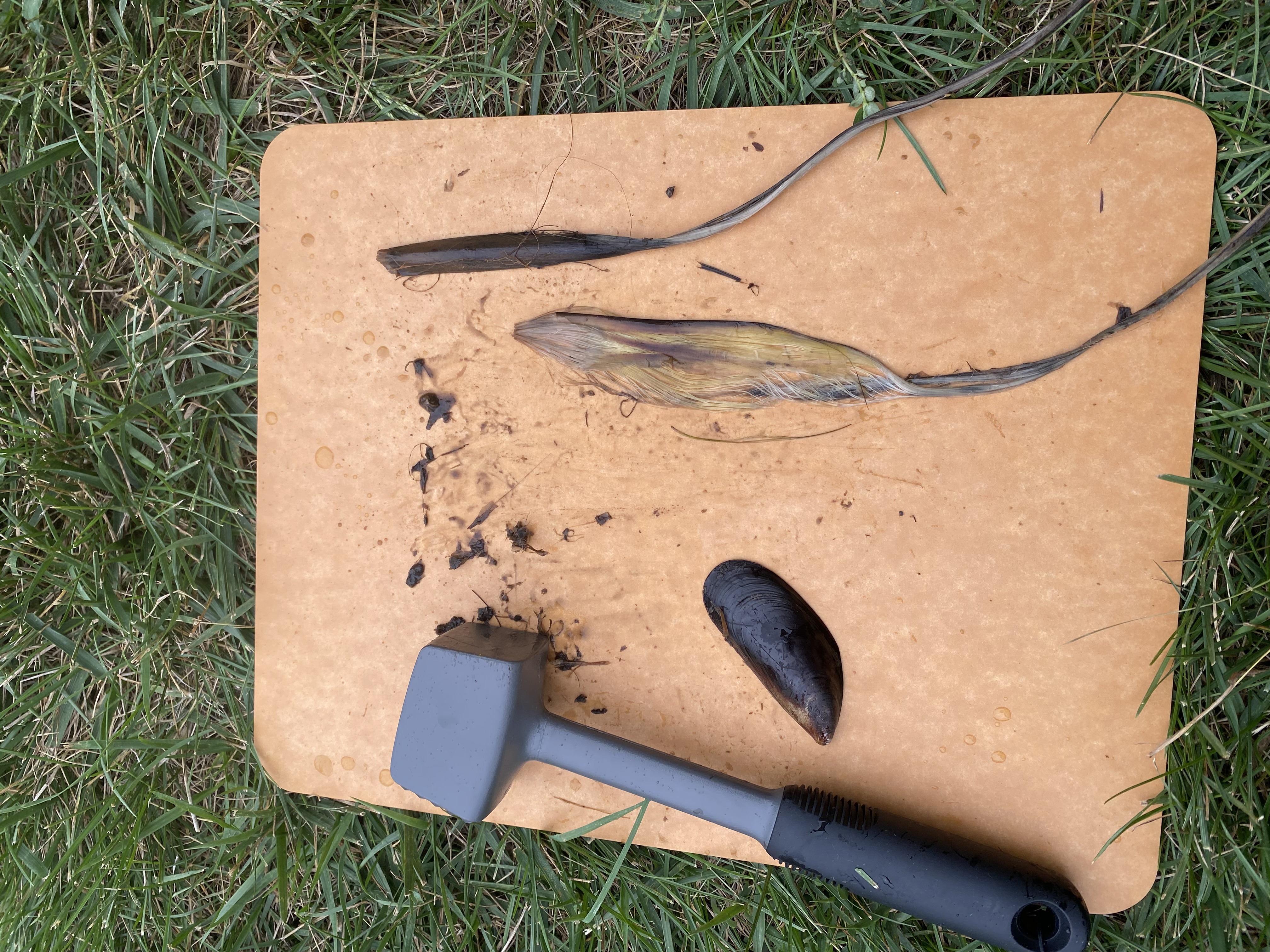 Scraping the remaining yucca leaves with a mussel shell and pounding them with a kitchen mallet.