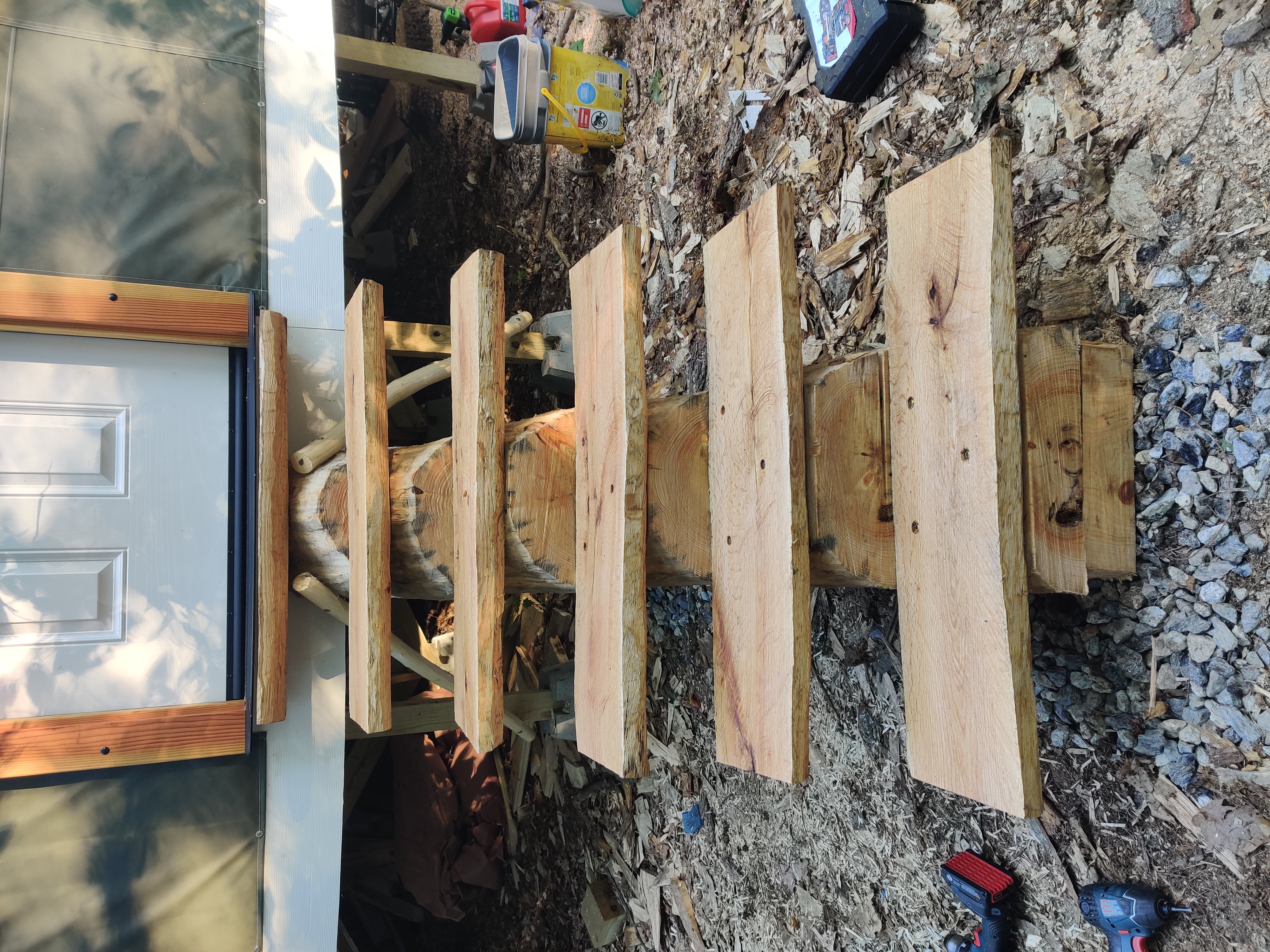 I made two mistakes. I forgot to check my plans and cut the first step too shallow after I went and cut the bottom off. So I simply cut off another 2 inches from the stringer on the bottom step, but that left the entire stringer a few inches shorter than I planned, so you'll see a cookie added to the very bottom. Second mistake, propped up the stringer log as I cut the wedges out for stairs and eyeballed the correct angle that I had the log propped up. I also measured 60 over and 40 up, but hard to do on uneven and leafy forest ground. Anyway, it wasn't propped up enough, slightly too shallow, so you will see as I cut the wedges out that the bottom step has the most stringer surface area to attach to, but as you go up there is progressively less (see how the top stair barely hangs on). My eyeballing was good enough as there was just enough to attach to, granted I used beefy GRK screws. Third, not a mistake per se, but the top stair had the opposite of an overhang, so I failed my rise/run of 7/10 inches there... Used the logs I had, can fix in the future for safety. Also, I planned 1 inch overhang, but again, just barely had the diameter available with what I had at the time. I'm happy. All wood came from the trees that had to be sacrificed to make room for the yurt. Waste nothing, appreciate everything.