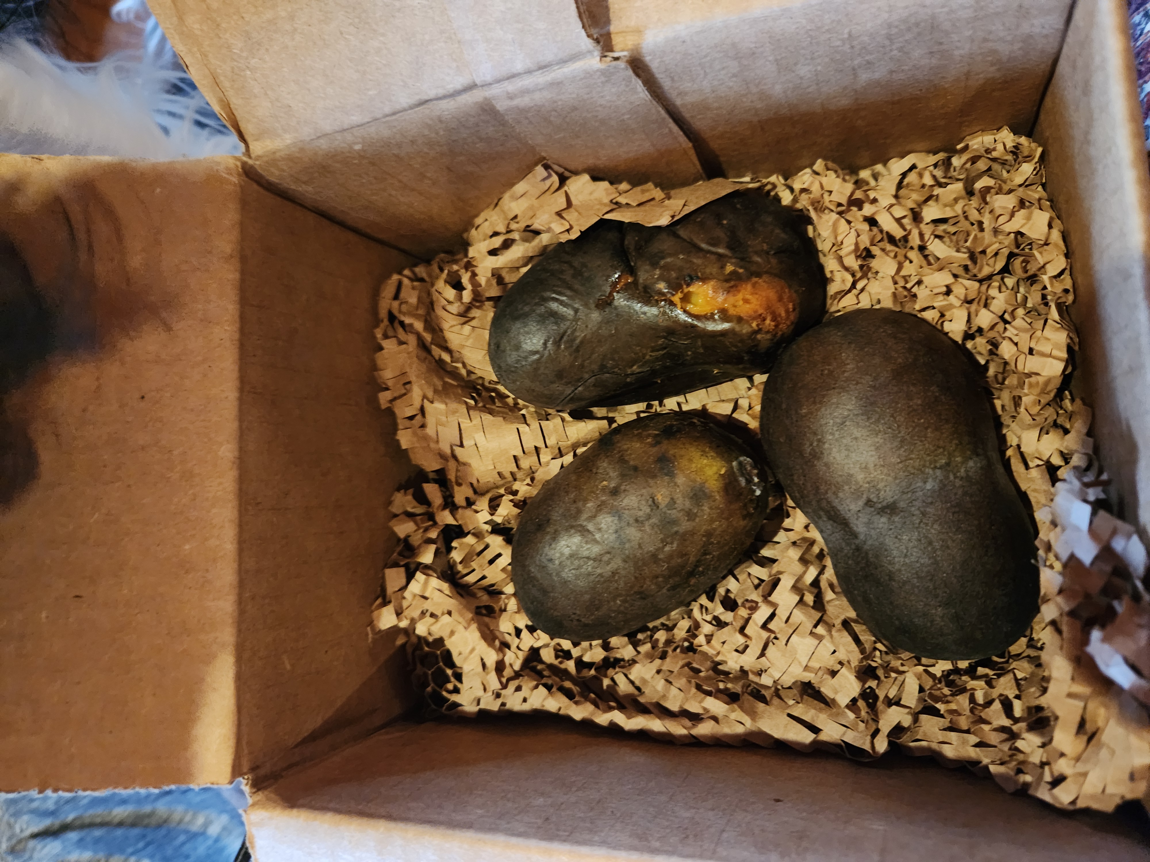 They came!! One had a scuff about the size of a quarter, on top, another had a tiny one a little smaller than a dime, on the bottom. We (very happily) at those two, and I popped the 3rd into the fridge, to eat tomorrow - IF the pawpaws like is a much as we like them, tonight. In the meantime, the seeds from the first two are in prep to be planted.
