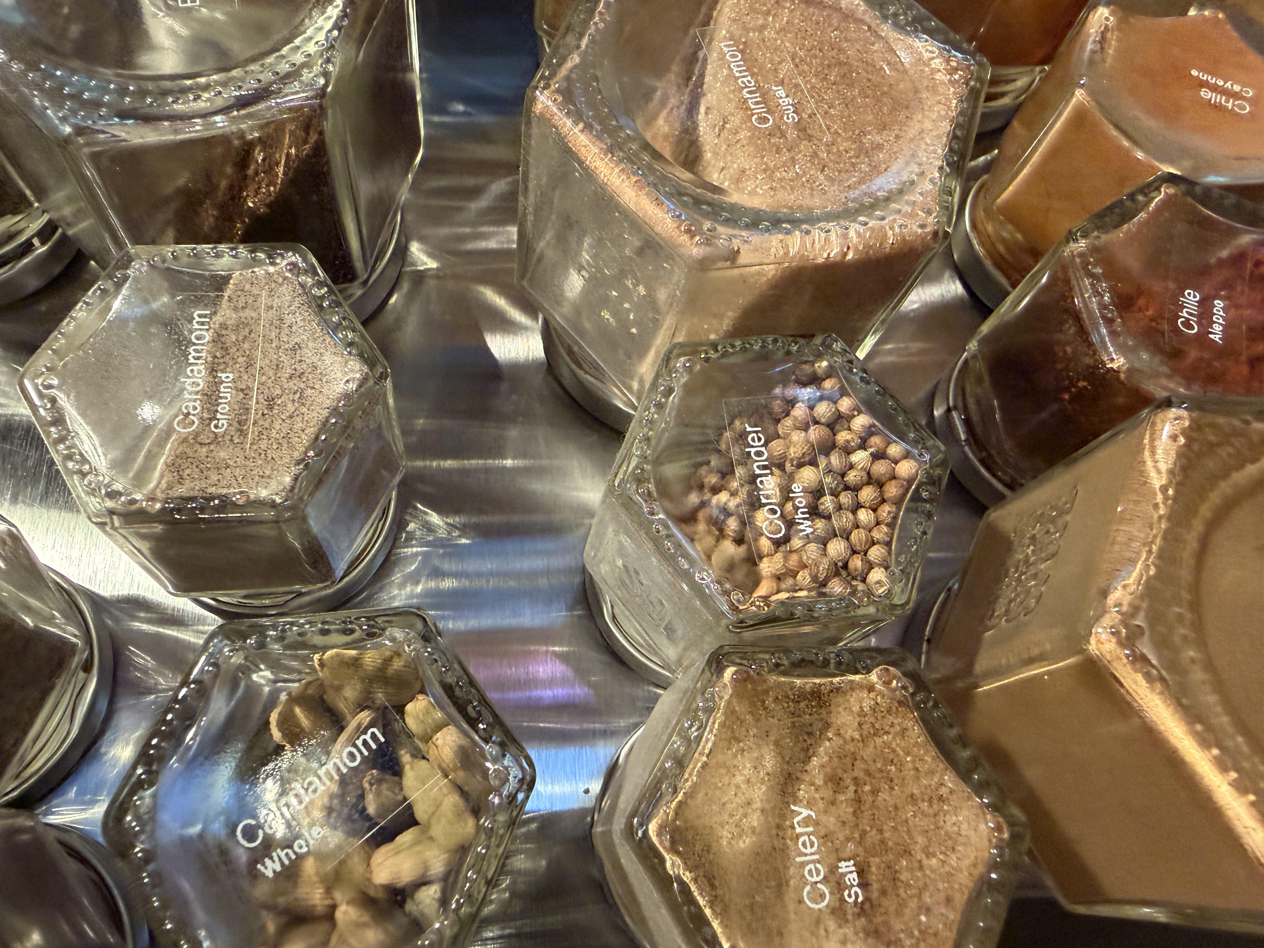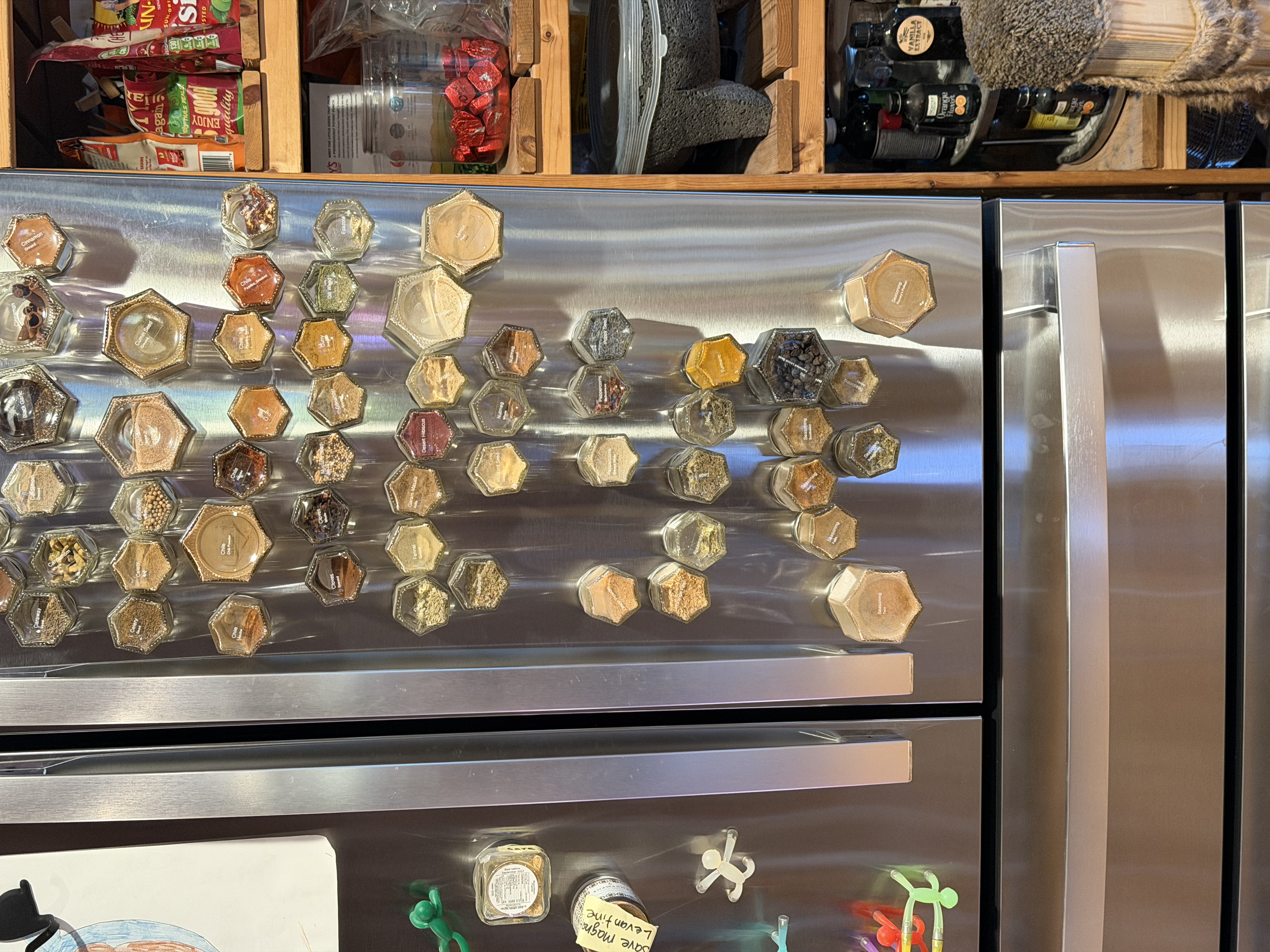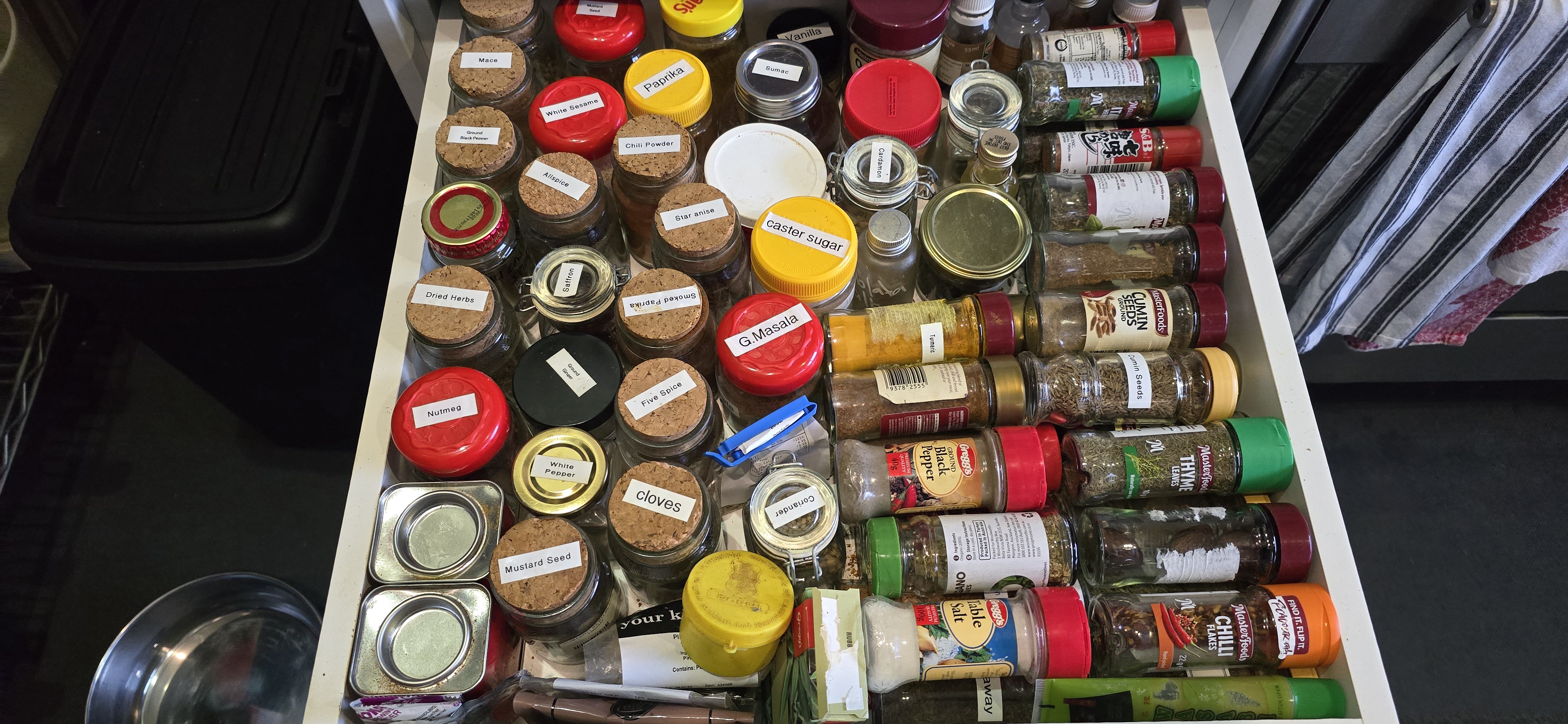 i have an entire cabinet drawer specifically for (most of my) spices, which are kept in small glass jars out of the light and humidity. I keep some bags for refilling, generally another small jar's worth for the things I use most, almost all whole spices or leaves (not ground spices, with the exception of cardamom, which I only get when I travel).