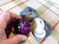 True potato seed X "Skye blue" the parent is an early maincrop with floury tubers with dark purple skin, white flesh with a purple ring.