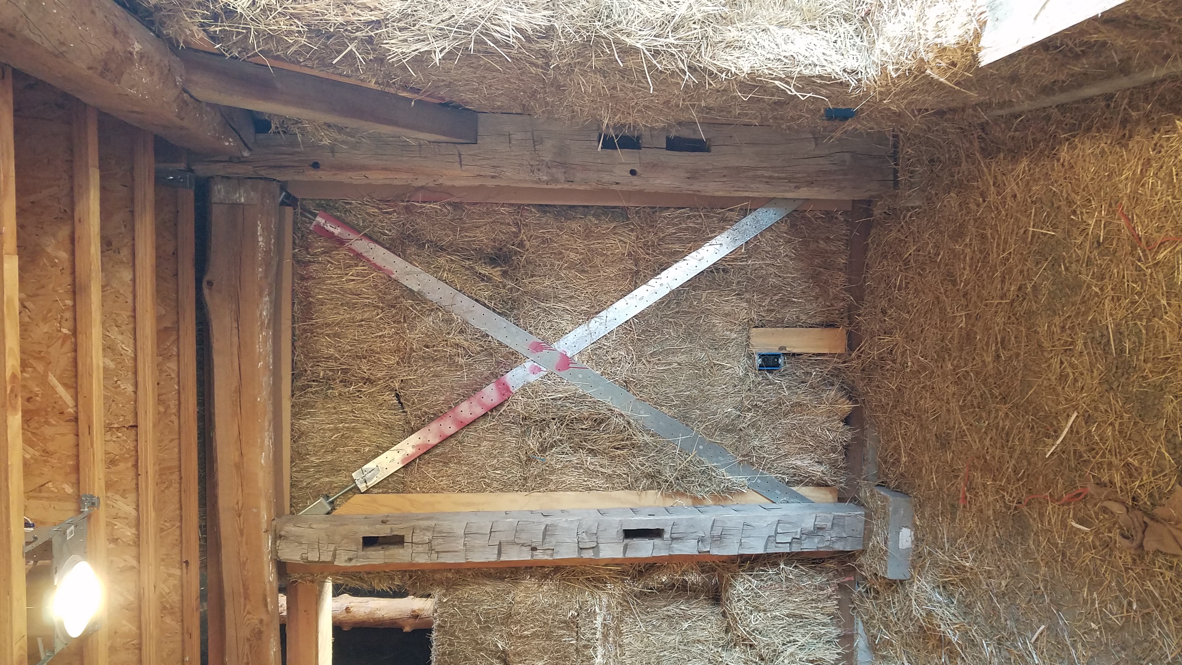 The frame itself was in outstanding condition—clearly able to resist the snow loads and wind forces it experienced for over a century on the Wisconsin prairie. However, when wrapped with straw bales on a building site where earthquakes are common, supplemental bracing was needed. In this case the engineer specified steel strap tension only “X” bracing at several places around the building perimeter, carefully anchored at the sill and top plates, to handle in-plane forces (like wind or earthquakes applied parallel to the walls). There are at least nine other ways to address in-plane forces with straw bale walls, all detailed in the book.