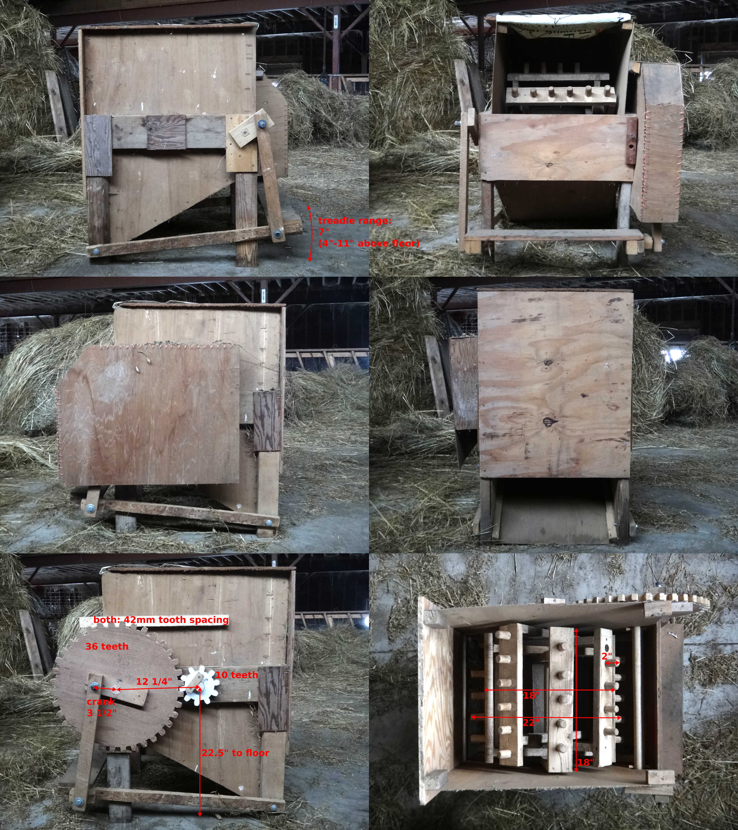 The business end of the thresher is a drum made of eight boards stuck full of stubby peggs. You hold sheaves of grain, soybeans plants, or heads of amaranth against the pegs as they spin away from you. You can also pour picked pods of dry legumes through a hole in the top while the front opening is covered. Either way, the pegs whack the seeds out, which then fall down to the slanted bottom and slide out the back onto a tarp or swept floor. They'll whack your fingers if you get too close, which could break them, but at least won't take off an arm like a tractor-powered machine. Don't get to close, and let go if it suddenly grabs what you're threshing.