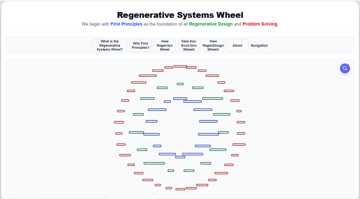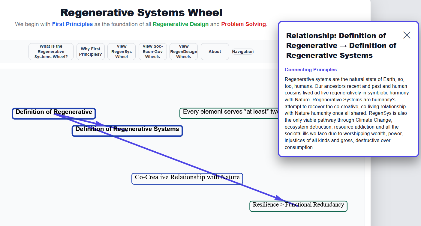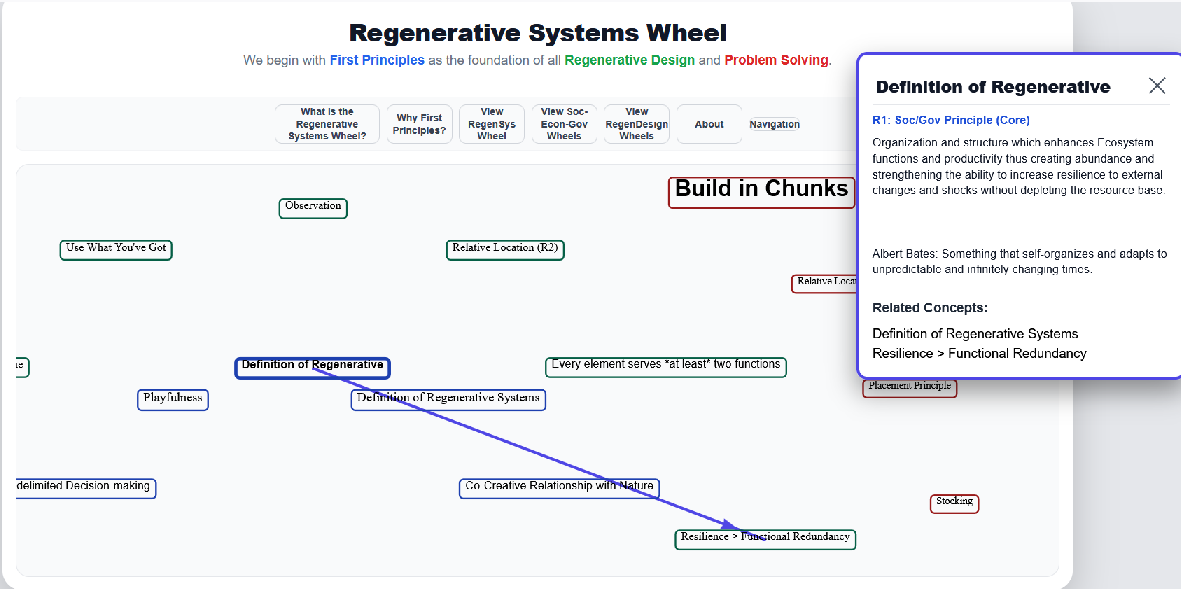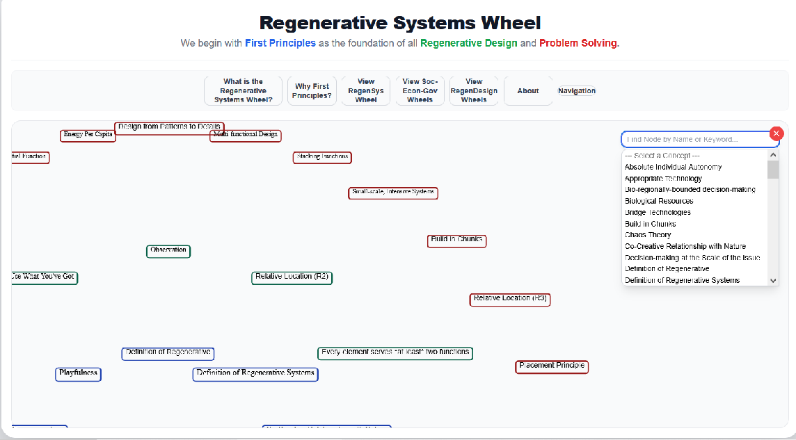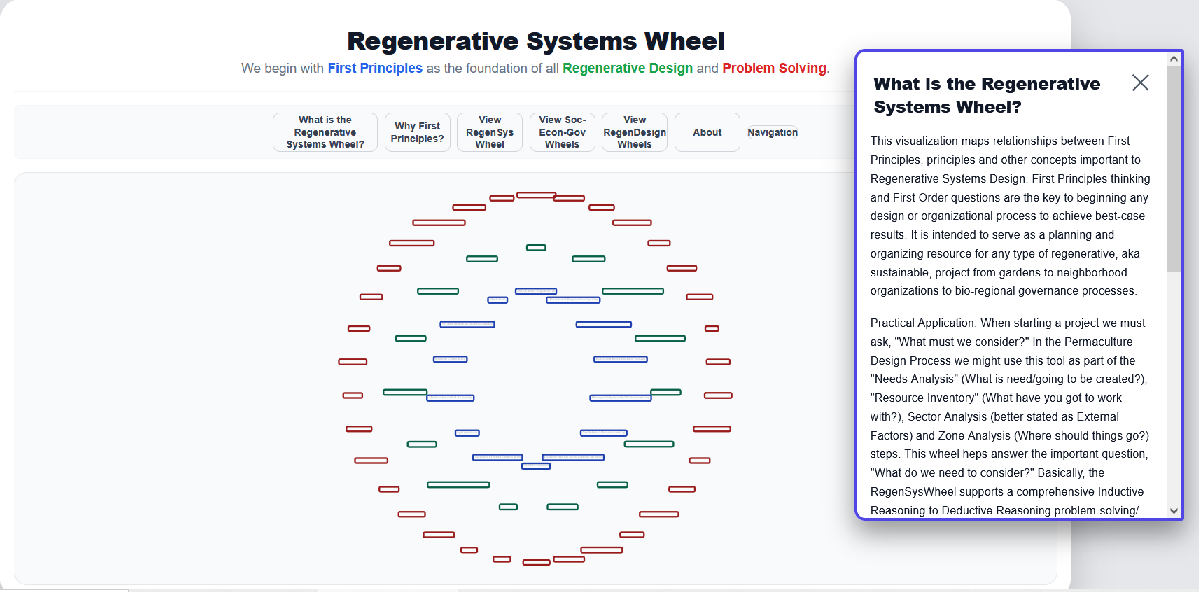 The Regenerative Systems Wheel is a relational, interactive semantic map of well over forty principles, concepts, characteristics, etc., we would all do well to include not only in our work, but in our understanding of the world around us. The inspiration for this app was the hundreds or thousands of times I found key ideas, questions, and principles not being part of discussions, projects, organizing efforts, design processes, etc. Sometimes it's been a lack of awareness of the import of these ideas, and sometimes it has been simply not knowing of their existence.