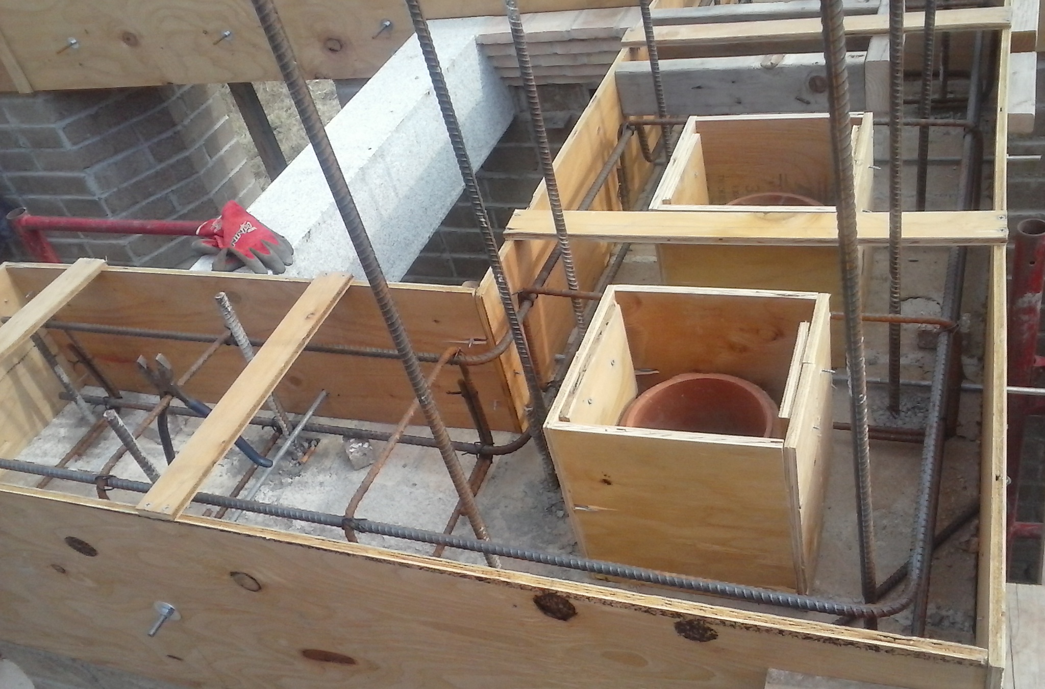 The image shows the formwork for 10" thick bond beam - the section around the chimney ducts and above the kitchen window.